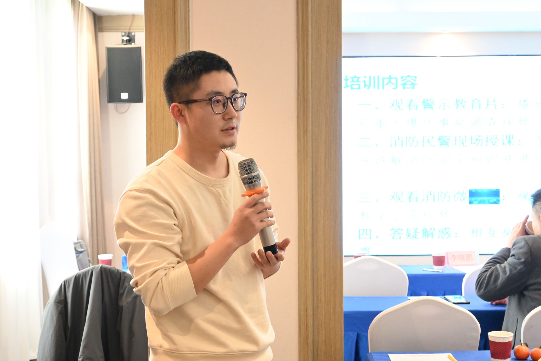 會議第三項,由東儀路派出所李曉鵬警官向與會人員現(xiàn)場授課,系統(tǒng)講解防詐反詐、消防安全等知識,并演示消防設(shè)備使用方法。