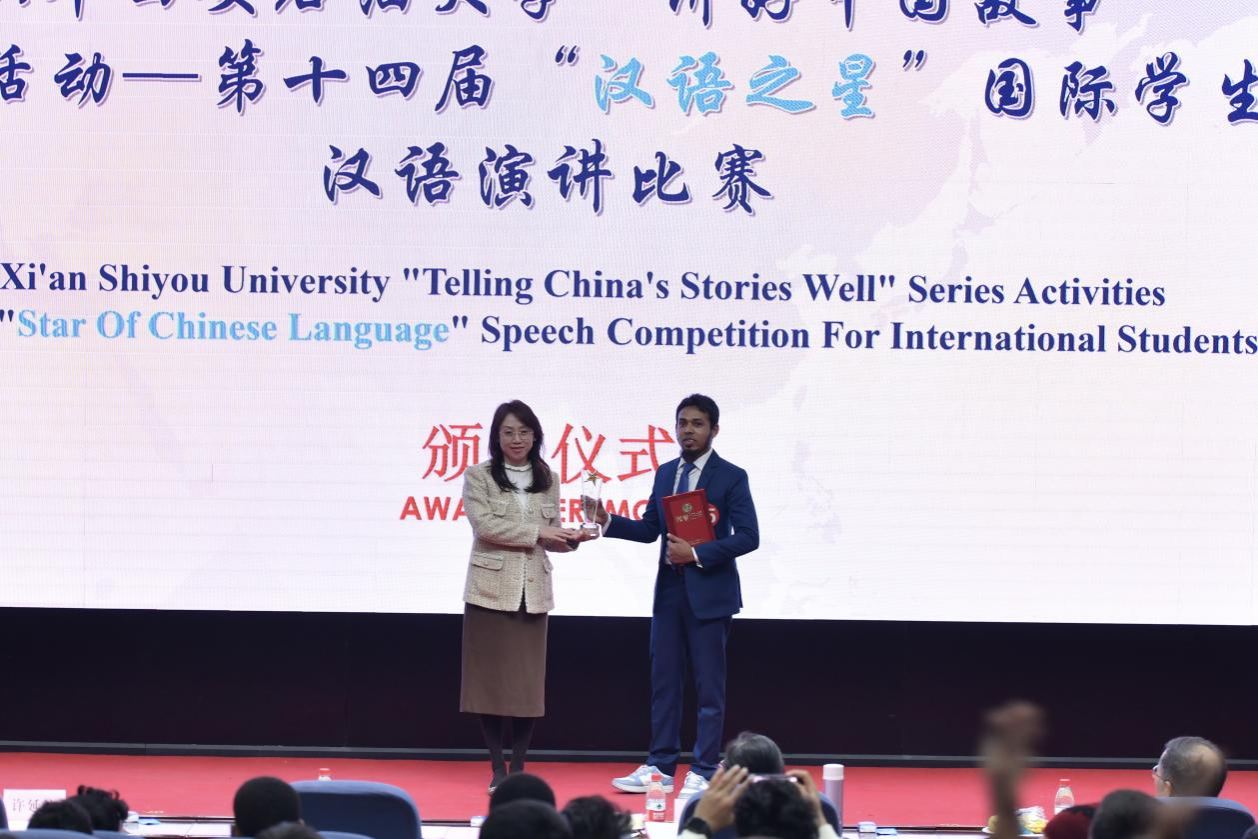 經(jīng)過激烈的角逐,來自孟加拉國的哈桑同學(xué)憑借其出色的演講內(nèi)容和表現(xiàn),榮獲一等獎。申李平安、簡愛克、伊卡三名同學(xué)獲得二等獎,韓沐恩、曾美麗、七人組合、月亮及拉德蒙五組選手獲得了三等獎。學(xué)院院長董皓、副院長秦璟及特邀評委代表許延浪教授分別為獲獎選手頒發(fā)了獎杯和獲獎證書。特邀評委代表柯卓英教授對比賽進(jìn)行了總結(jié)點評。