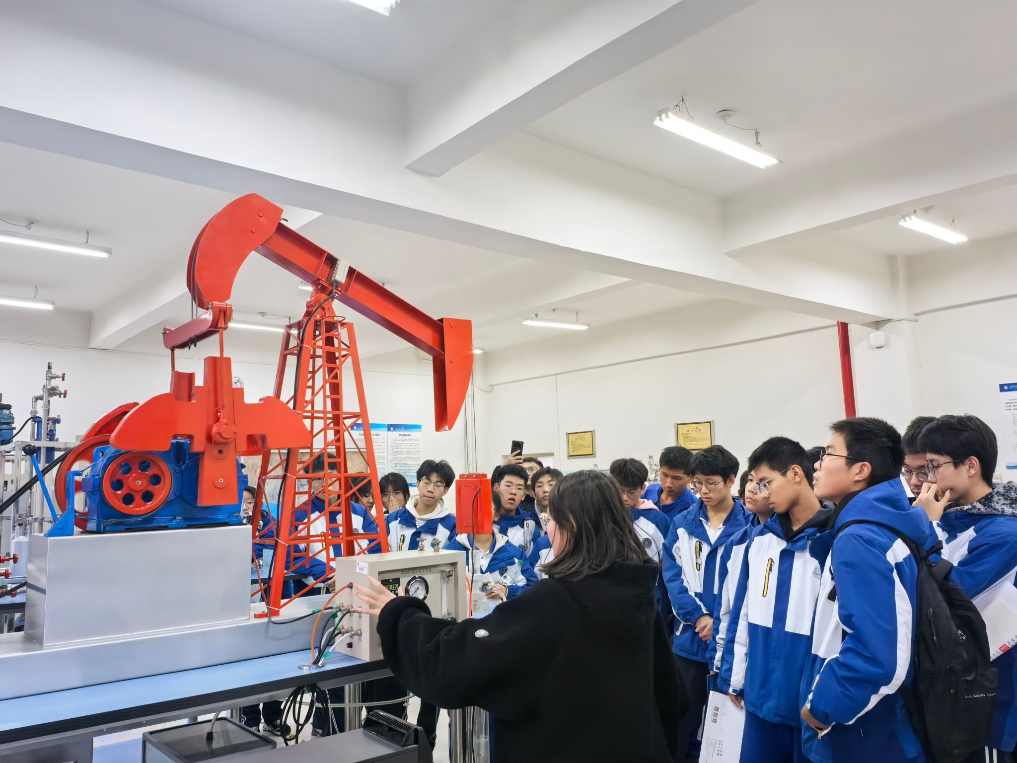 研學活動最后一站參觀了我校陜西省石油石化虛擬仿真實驗教學中心。在講解員的帶領下,五高師生參觀了鉆井實訓室、地質(zhì)標本實訓室、采油實訓室、油氣分布沙盤、集輸、煉化實訓室、采油實訓室,使學生初步了解了石油勘探、開采和運輸?shù)娜^程,近距離感受到了石油石化及地質(zhì)行業(yè)的魅力與挑戰(zhàn)。