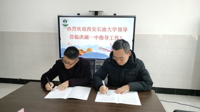 在洪湖市,學(xué)校一行與洪湖市第一中學(xué)副校長戴裕明等領(lǐng)導(dǎo)進(jìn)行座談。雙方介紹了各自的辦學(xué)歷史、辦學(xué)規(guī)模、辦學(xué)特色,并就繼續(xù)開展更為深入的合作進(jìn)行深入交流。張建高代表學(xué)校與洪湖市第一中學(xué)領(lǐng)導(dǎo)共同簽署《西安石油大學(xué)優(yōu)秀生源基地建設(shè)協(xié)議》,授予“優(yōu)秀生源基地”牌匾并贈送了錄取喜報。