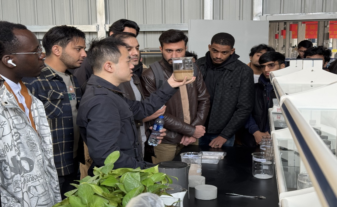 活動開始,留學(xué)生們來到西安湄南生物科技股份有限公司研發(fā)中心,認(rèn)真觀察防沙治沙“黑科技”的合成,并與技術(shù)人員交流,詢問生產(chǎn)流程和技術(shù)細(xì)節(jié),感受中國企業(yè)為全球荒漠化治理的探索與創(chuàng)新。