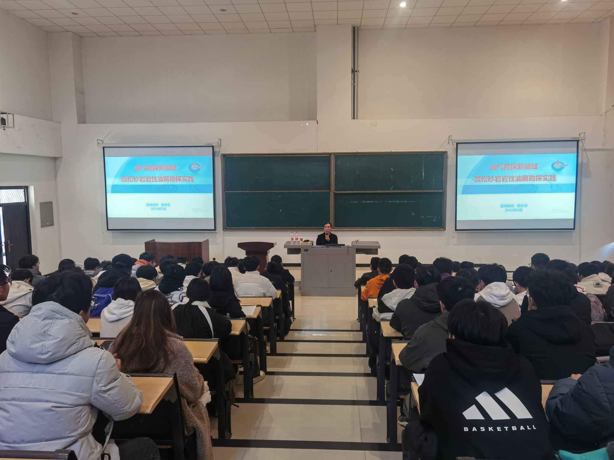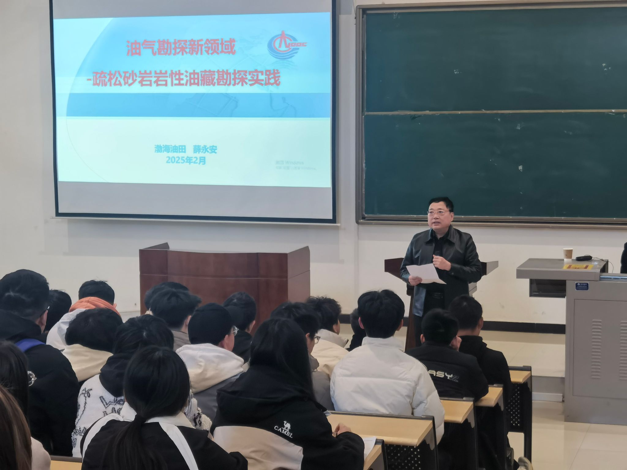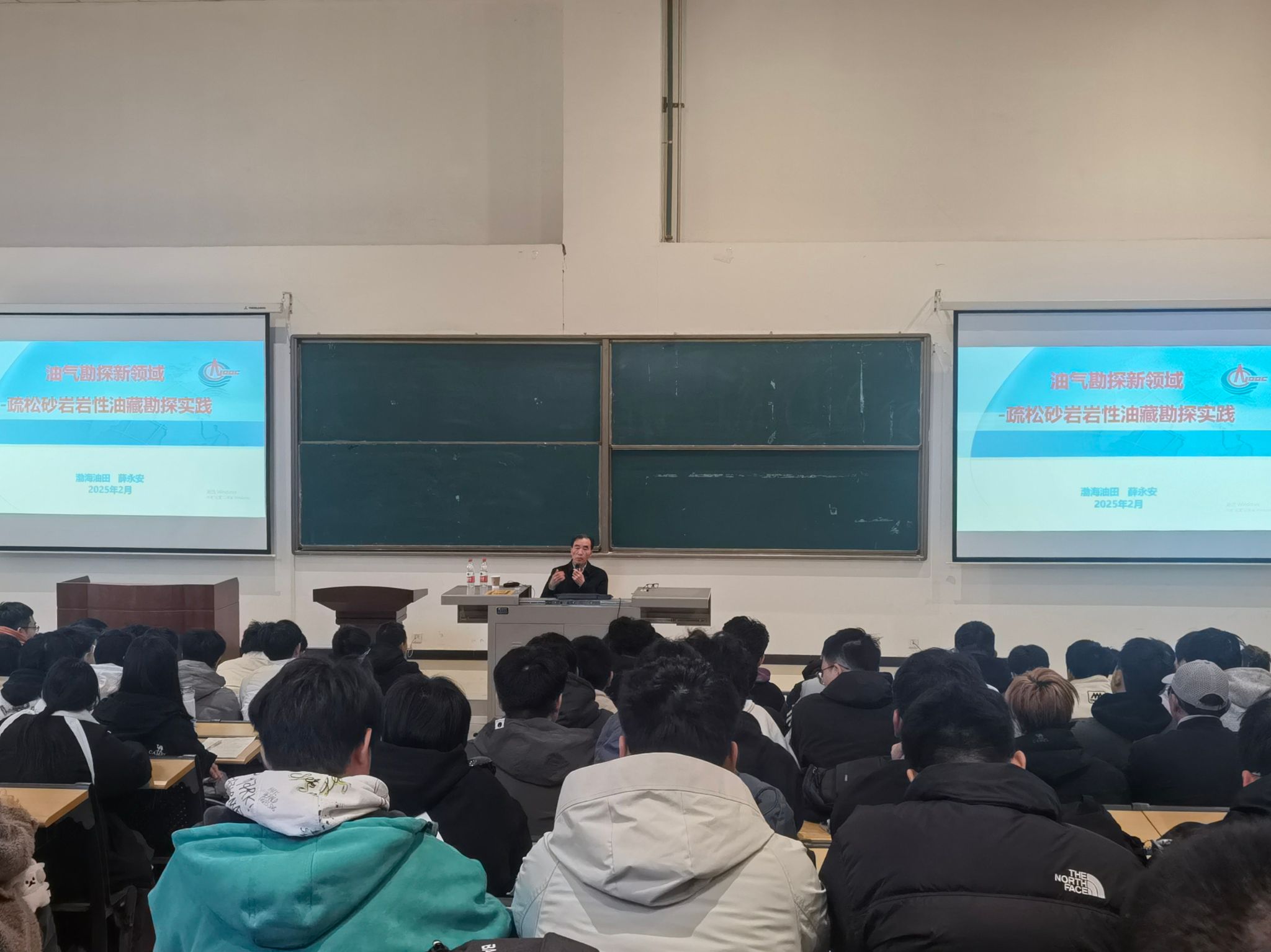 薛永安教授首先分享了自己近40年的油氣地質(zhì)科研經(jīng)驗(yàn),而后以渤海油田源外構(gòu)造空白區(qū)新生界疏松砂巖巖性油藏勘探重大突破及系列理論創(chuàng)新為切入點(diǎn),鼓勵(lì)同學(xué)們?cè)趯W(xué)習(xí)中秉承腳踏實(shí)地、大膽假設(shè)、小心求證的原則,守正創(chuàng)新,努力成為未來(lái)我國(guó)能源領(lǐng)域頂?shù)蒙?、接得住的中?jiān)力量。講座現(xiàn)場(chǎng)氣氛熱烈。