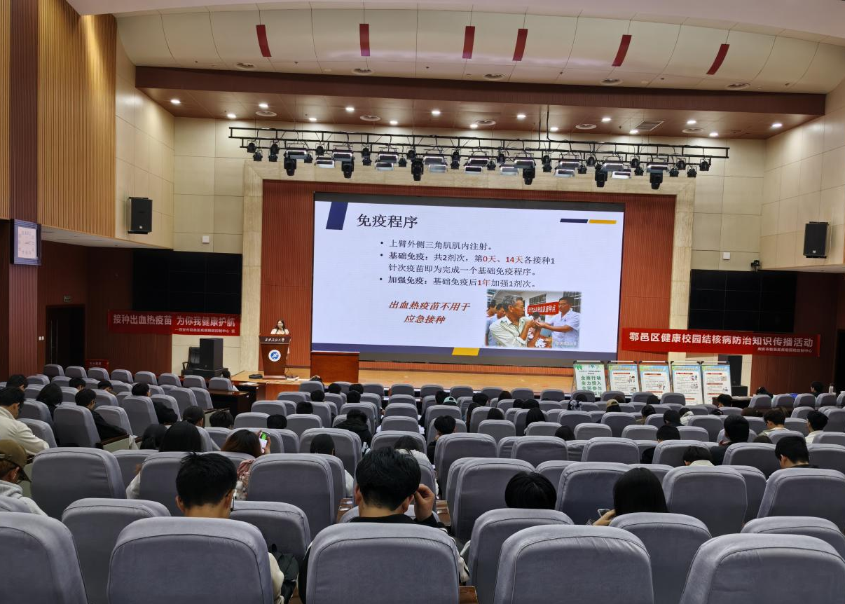 講座中,各位專家、老師結(jié)合自身多年工作經(jīng)歷,詳細(xì)介紹了什么是肺結(jié)核以及肺結(jié)核的潛伏期表現(xiàn)、如何預(yù)防和治療肺結(jié)核病。鄠邑區(qū)疾控中心鄭美辰老師給大家講了關(guān)于流行性出血熱病原學(xué)特征、傳播途徑、典型癥狀及防治要點,詳細(xì)介紹了疫苗接種、個人防護(hù)、環(huán)境衛(wèi)生整治等防控措施。專家們的講座充分考慮大學(xué)生實際,語言淺顯易懂,大家受益匪淺?,F(xiàn)場還通過互動問答等形式增加了講座的趣味性,幫助師生及居民提升防治結(jié)核病、流行性出血熱的意識,取得了良好的教育宣傳效果。