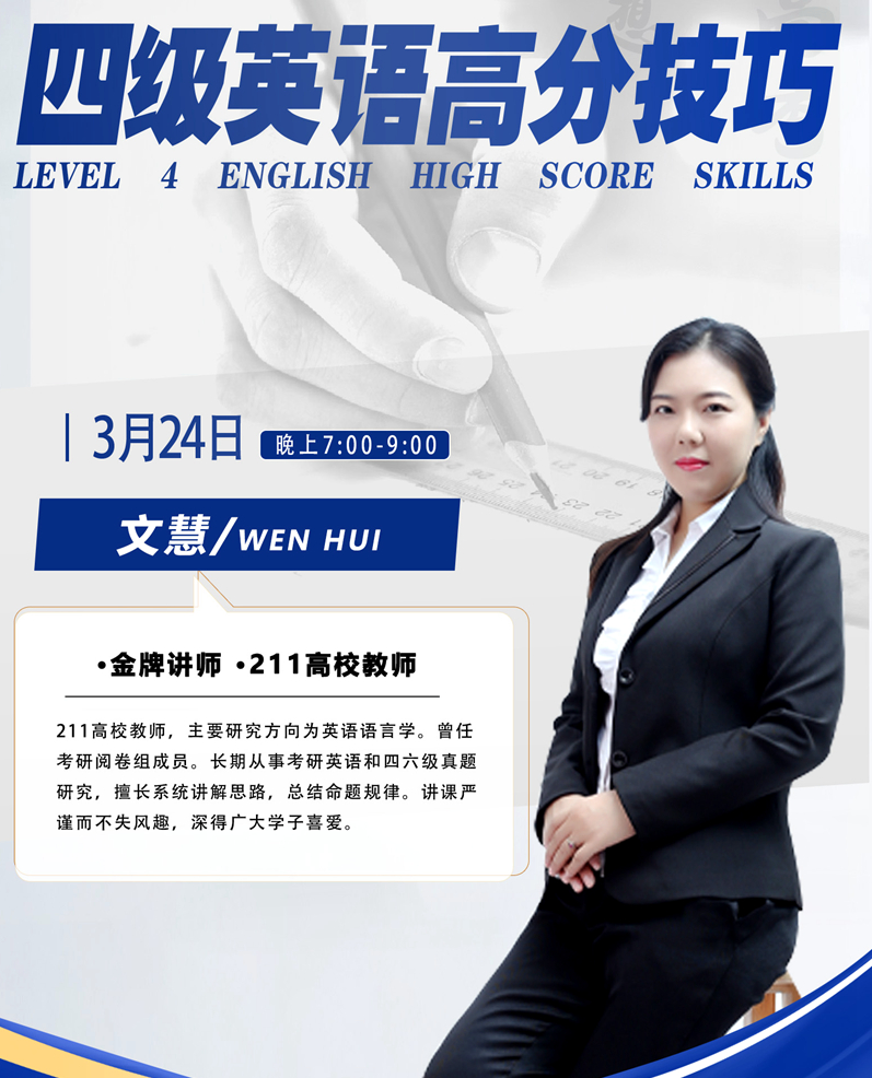 講座伊始,文慧老師以風(fēng)趣幽默的語(yǔ)言點(diǎn)明了英語(yǔ)四級(jí)考試在大學(xué)學(xué)習(xí)生涯中的重要地位,調(diào)動(dòng)同學(xué)們的學(xué)習(xí)熱情。隨后,通過深入剖析四級(jí)考試的題型結(jié)構(gòu),針對(duì)聽力、閱讀、寫作、翻譯四個(gè)板塊,分享獨(dú)家高分技巧。在聽力部分,文慧老師強(qiáng)調(diào)預(yù)讀選項(xiàng)的關(guān)鍵作用,通過實(shí)例詳細(xì)講解如何從選項(xiàng)中預(yù)判聽力內(nèi)容,鎖定重點(diǎn)信息。閱讀板塊,著重介紹不同題型的解題思路,從快速定位原文到分析長(zhǎng)難句,幫助同學(xué)們理清閱讀答題邏輯。寫作環(huán)節(jié),老師展示了豐富多樣的寫作模板,并指導(dǎo)同學(xué)們?nèi)绾戊`活運(yùn)用,使文章脫穎而出。翻譯方面,則提醒同學(xué)們關(guān)注中英語(yǔ)言差異,巧用詞匯與句式轉(zhuǎn)換。整場(chǎng)講座互動(dòng)熱烈,同學(xué)們反響良好。