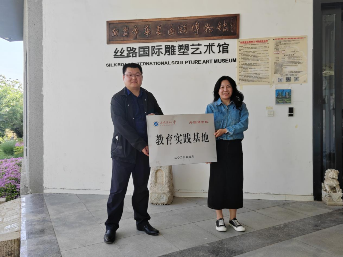 張建高、邱嶺與絲路國際雕塑文化藝術(shù)園負責人熱切交流。在交流中,雙方就合作的方向、內(nèi)容以及未來的發(fā)展規(guī)劃等進行了深入探討,在大家的共同見證下,外國語學(xué)院在絲路國際雕塑文化藝術(shù)園教育實踐基地正式掛牌。