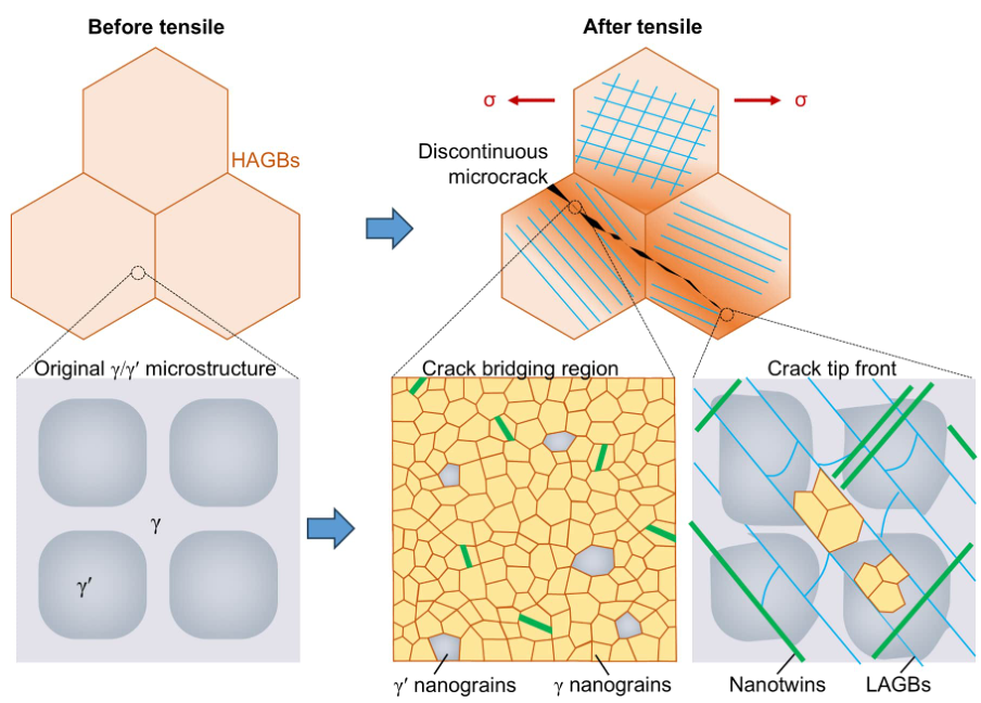 本研究首次揭示了EBPBF制備的IN738高溫合金在低應變率(1×10?3 s?1)拉伸載荷下剪切帶介導的斷裂新機制。通過優(yōu)化電子束掃描策略與熱場控制,成功制備出缺陷率低、柱狀晶<001>織構顯著的致密高溫合金,其性能優(yōu)于鑄造IN738合金。研究發(fā)現(xiàn),EBPBF工藝制備的高溫合金中納米碳化物均勻分布,有效抑制裂紋萌生,并通過剪切帶作用實現(xiàn)穿晶斷裂。裂紋擴展路徑中形成的剪切帶伴隨γ'強化相納米化與動態(tài)再結晶現(xiàn)象,通過位錯滑移與孿生協(xié)同作用耗散裂紋能量,顯著提升了合金的裂紋擴展阻力。該研究為高性能高溫合金的可靠性設計提供了理論支撐。
