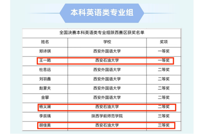 本屆大賽我校學(xué)生分別參加了本科非英語(yǔ)專業(yè)組、本科英語(yǔ)類專業(yè)組兩個(gè)組別的比賽,共有2518名同學(xué)報(bào)名參加。校賽結(jié)束后共有169名同學(xué)進(jìn)入省賽,經(jīng)過(guò)激烈角逐,我校共獲得省賽特等獎(jiǎng)1人,一等獎(jiǎng)5人,二等獎(jiǎng)16人,三等獎(jiǎng)20人。最終王思思、劉鈺歆、李子達(dá)3位同學(xué)獲得本科非英語(yǔ)類專業(yè)組省賽一等獎(jiǎng)并晉級(jí)國(guó)賽;王一飏、楊義瀾、胡佳美3位同學(xué)分別獲得本科英語(yǔ)類專業(yè)組省賽特等獎(jiǎng)和一等獎(jiǎng)并晉級(jí)國(guó)賽。