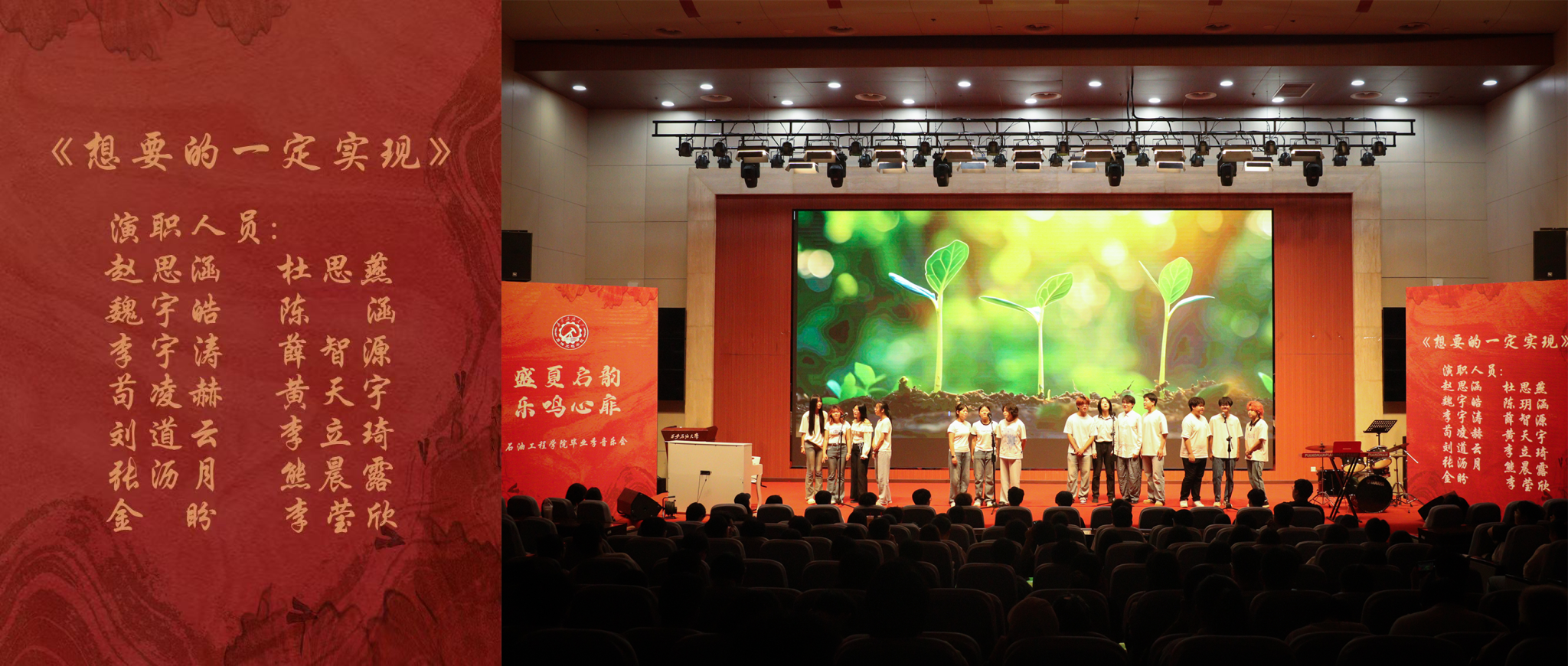純凈清澈的《想要的一定實現(xiàn)》阿卡貝拉率先響起:錯落交織的人聲編織出充滿希望與決心的樂章,錯落有致的和聲仿佛是初代教育工作者們立下的錚錚誓言,篤定要在石油教育領(lǐng)域開拓出一片新天地。
