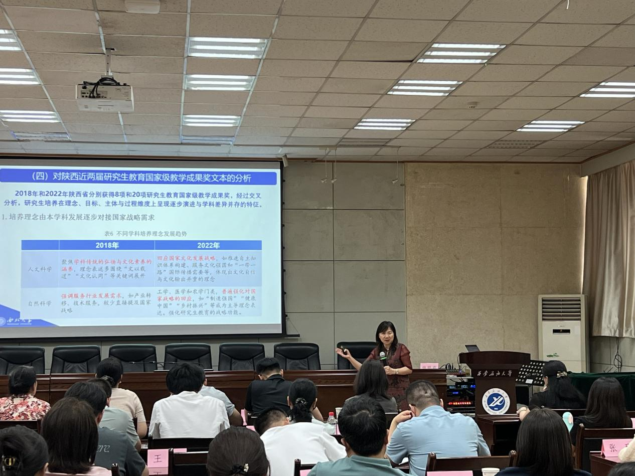 西北大學(xué)姚聰莉教授以《教學(xué)成果獎(jiǎng)的詞云分析及成果培育》為題,首先從培養(yǎng)理念、目標(biāo)、主體和過程四個(gè)視角,對前三屆國家級(jí)教學(xué)成果獎(jiǎng)做了詞云分析,梳理出人才培養(yǎng)范式的基本特征和變化趨勢。進(jìn)而圍繞教學(xué)成果獎(jiǎng)的內(nèi)涵特征、培育路徑、申報(bào)書撰寫與成果凝練、申報(bào)注意事項(xiàng)等方面進(jìn)行了系統(tǒng)講解。她強(qiáng)調(diào),教學(xué)成果應(yīng)體現(xiàn)鮮明的時(shí)代特征、突出的問題導(dǎo)向與創(chuàng)新意識(shí),同時(shí)應(yīng)在理論高度、實(shí)踐基礎(chǔ)與應(yīng)用成效上實(shí)現(xiàn)有機(jī)統(tǒng)一。成果培育要聚焦關(guān)鍵問題、破解改革難題,注重?cái)?shù)據(jù)支撐和以學(xué)生為中心的成果提煉原則。并建議盡早謀劃,集結(jié)力量開展協(xié)同攻關(guān),整合資源、打造優(yōu)勢互補(bǔ)的團(tuán)隊(duì),實(shí)現(xiàn)科研反哺教學(xué),推動(dòng)高質(zhì)量成果產(chǎn)出。