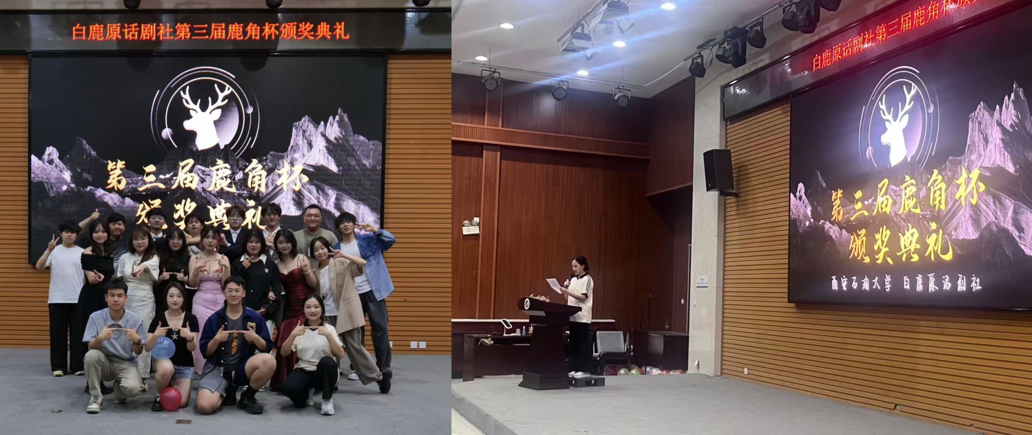 5月25日,白鹿原話劇社在崇文樓就業(yè)指導中心多功能廳舉辦第三屆白鹿原話劇社鹿角杯頒獎典禮。表彰社團干部為社團發(fā)展做出的貢獻,推動社團向前發(fā)展,通過表演新話劇展現(xiàn)話劇魅力,邀請同學進行才藝展示互動,共同感受話劇藝術,現(xiàn)場氣氛熱烈,受到師生一致好評。