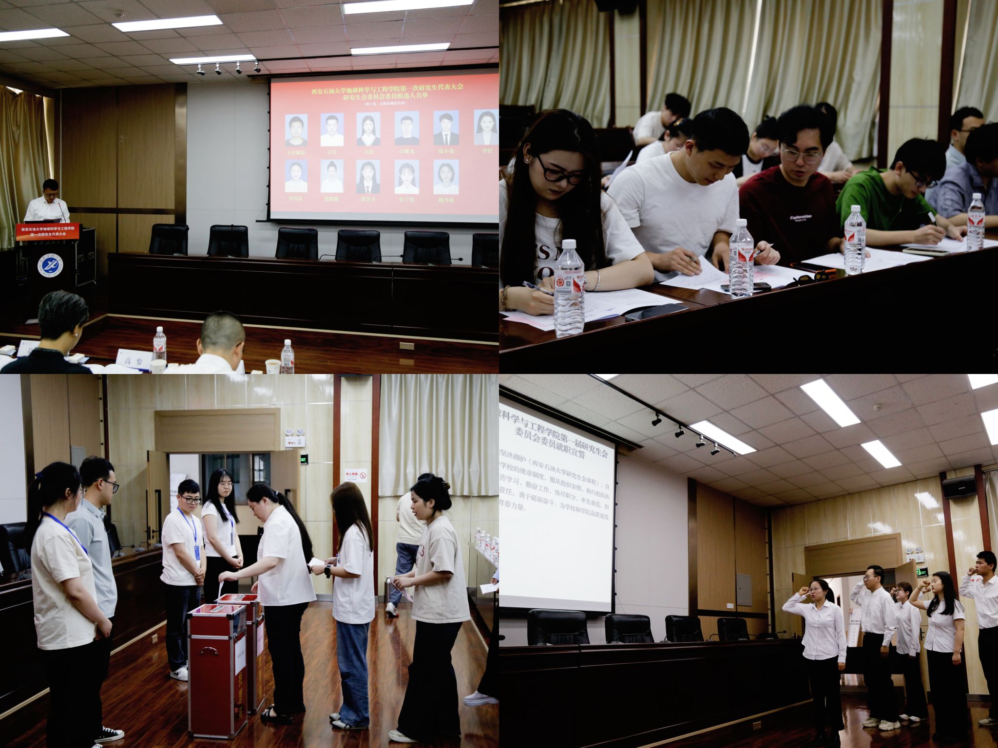 大會圓滿完成各項既定任務(wù),通過民主投票選舉產(chǎn)生了地球科學與工程學院第一屆研究生會委員會及主席團成員。地球科學與工程學院第一屆研究生會委員會全體成員,面向團旗就職宣誓。第一屆研究生會委員會代表范斯雅向大會作工作展望。最后,大會在全場齊唱的西安石油大學校歌《輝煌明天》中落下帷幕。會后,全體學生代表及參會嘉賓合影留念。