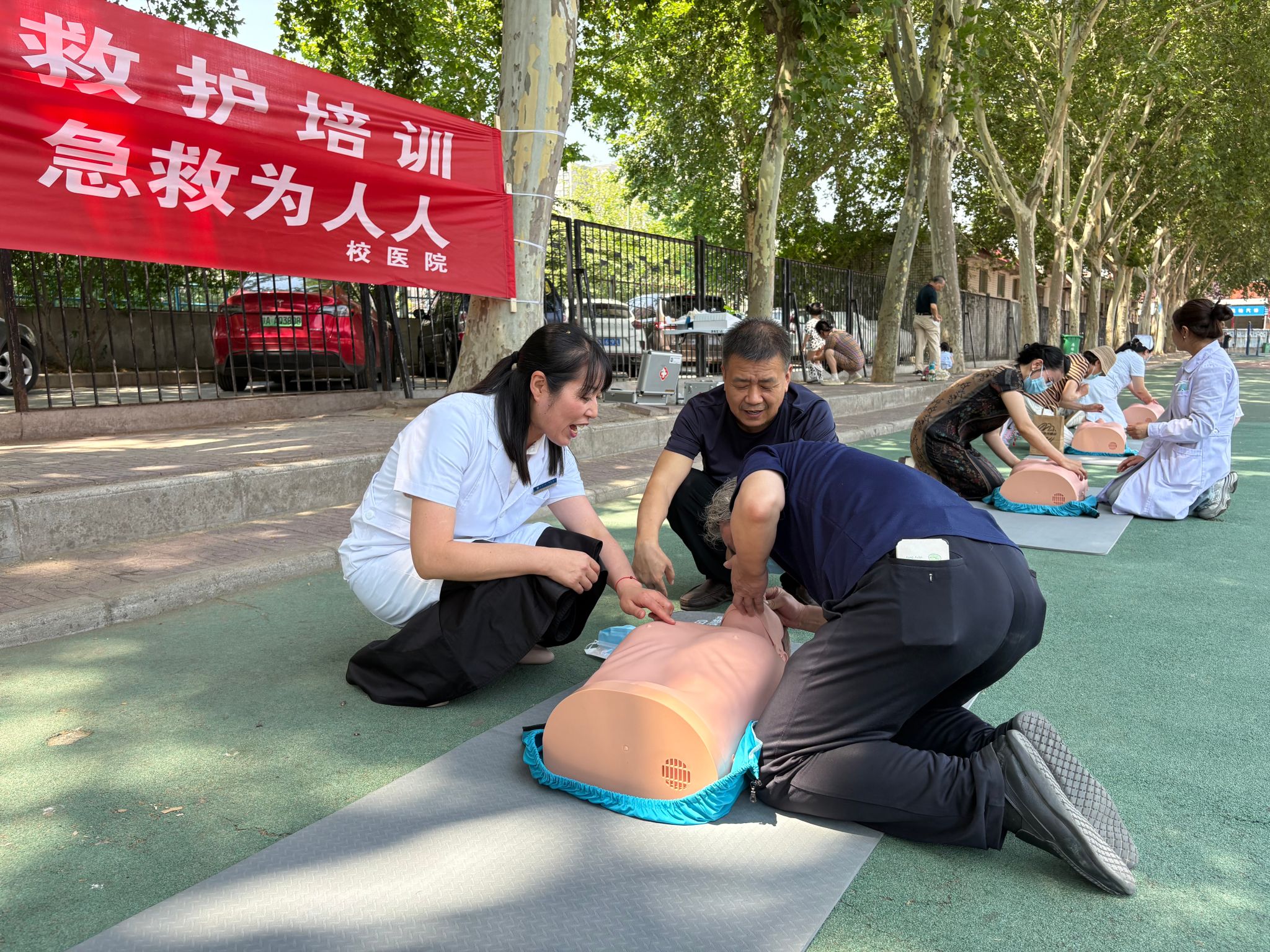 留學(xué)生群體克服語(yǔ)言障礙全程專注跟練,其投入狀態(tài)吸引路過的同學(xué)自發(fā)加入;黨員教職工在烈日下扎實(shí)操練,更就急救延伸問題與講師深入交流;尤為感人的是離退休老同志的參與--多位銀發(fā)長(zhǎng)者從社區(qū)義診駐足圍觀,到堅(jiān)持站立聆聽全程,甚至主動(dòng)跪地練習(xí)心肺復(fù)蘇,執(zhí)著精神令在場(chǎng)人員動(dòng)容。
