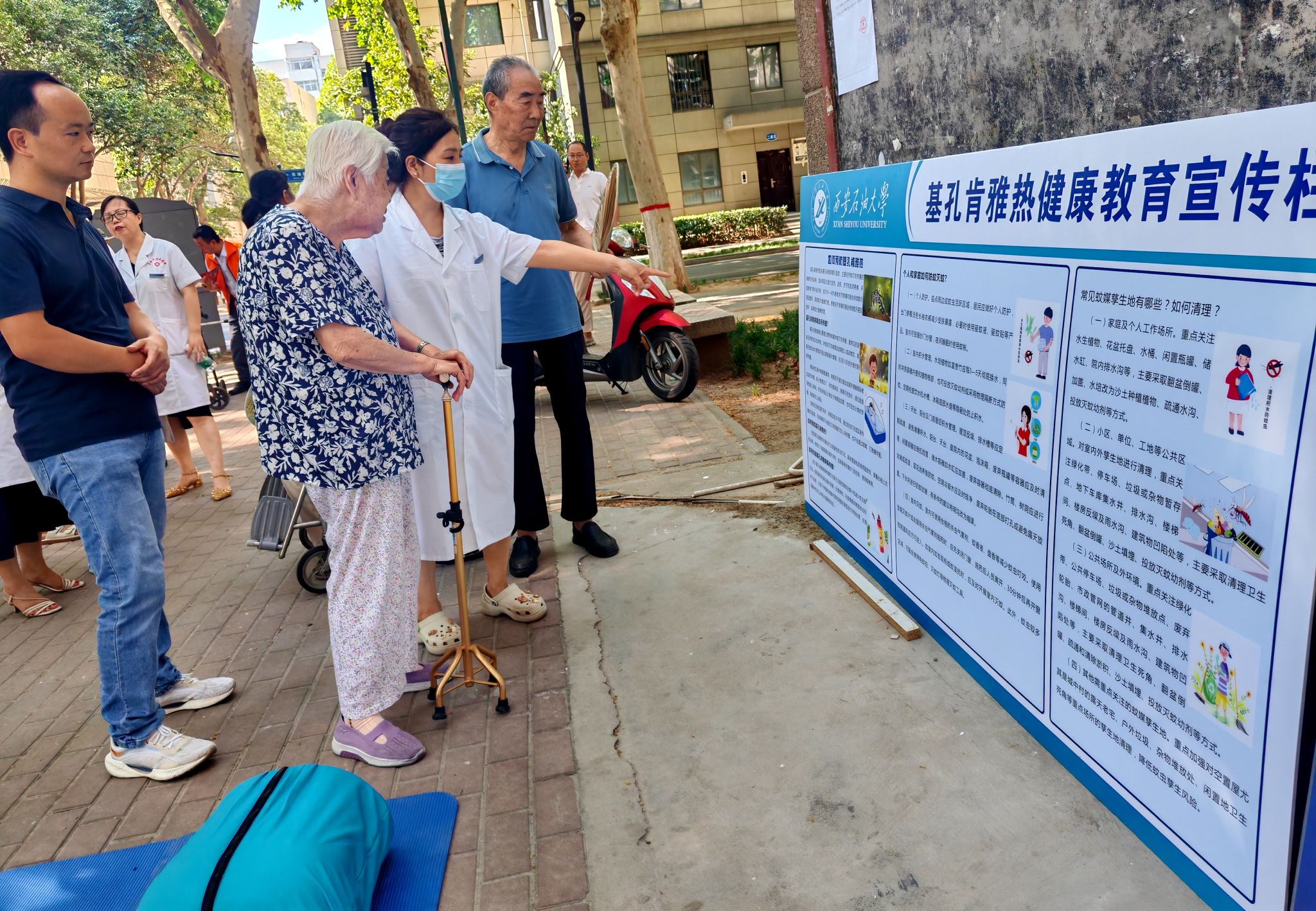 考慮到近期流行的蚊媒傳染病基孔肯雅熱,以及秋季高發(fā)的流感、手足口病等疾病,活動現(xiàn)場特別設(shè)置了科普展板與互動問答區(qū)。校醫(yī)院公衛(wèi)醫(yī)師結(jié)合實(shí)際案例,深入淺出地講解常見傳染病的傳播途徑與防控方法。在防蚊滅蚊方面,醫(yī)師給出了一系列科學(xué)合理的建議:及時清除家中及周邊各類積水容器,定期更換花卉花瓶中的水,安裝細(xì)密紗門紗窗阻擋蚊蟲進(jìn)入,合理使用蚊香、驅(qū)蚊液等防蚊用品,戶外活動時盡量穿著淺色長袖衣褲,全方位從源頭上杜絕蚊蟲滋生,有效減少疾病傳播風(fēng)險?;訂柎瓠h(huán)節(jié)中,居民們踴躍提問,現(xiàn)場氣氛十分活躍,大家你一言我一語,共同探討健康話題,極大地加深了大家對傳染病防治知識的理解與記憶,讓健康意識深入人心
