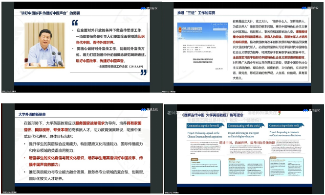 9月3日晚,外國(guó)語(yǔ)學(xué)院大學(xué)外語(yǔ)第一教學(xué)部組織全體教師參加由外語(yǔ)教學(xué)與研究出版社主辦的《理解當(dāng)代中國(guó)大學(xué)英語(yǔ)綜合教程》虛擬教研室系列研修活動(dòng)。本次系列研修活動(dòng)于9月至10月間分五期舉行。該系列研修系統(tǒng)覆蓋教材編寫理念解讀、三大單元教學(xué)分析與建議以及優(yōu)秀教案展示與交流等核心環(huán)節(jié),著力提升教師對(duì)中國(guó)話語(yǔ)體系構(gòu)建和中國(guó)敘事能力培養(yǎng)的專業(yè)化教學(xué)水平。