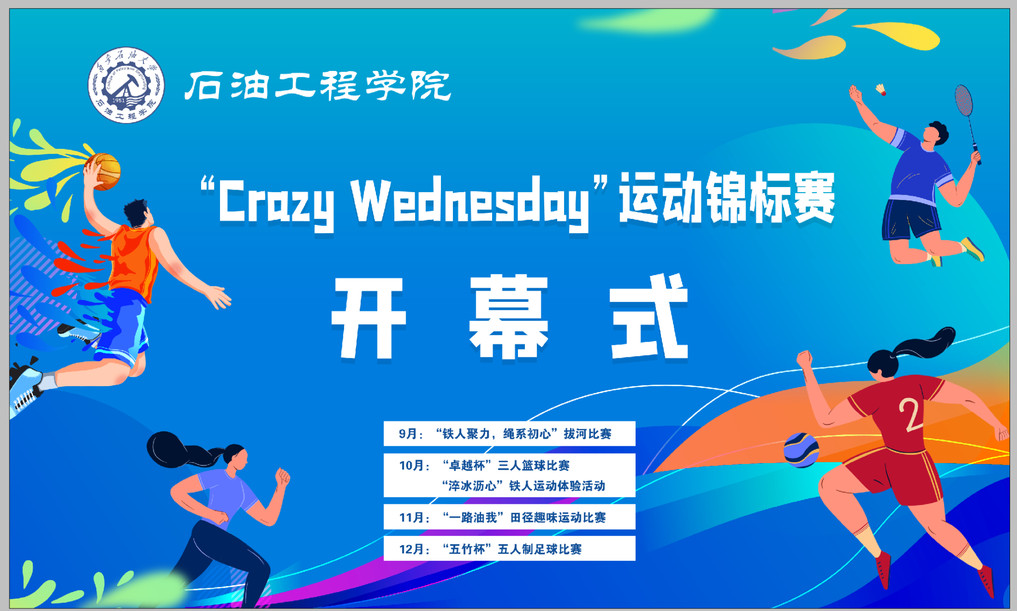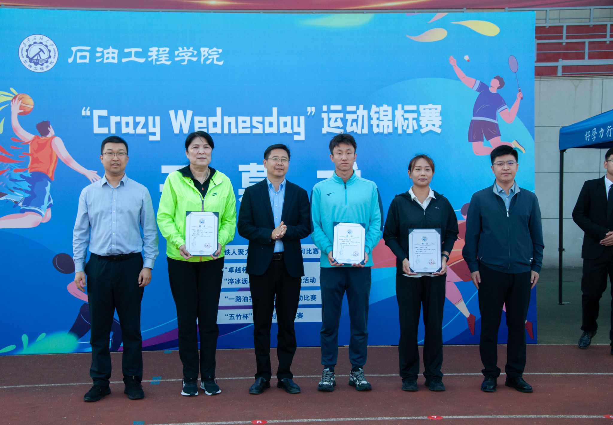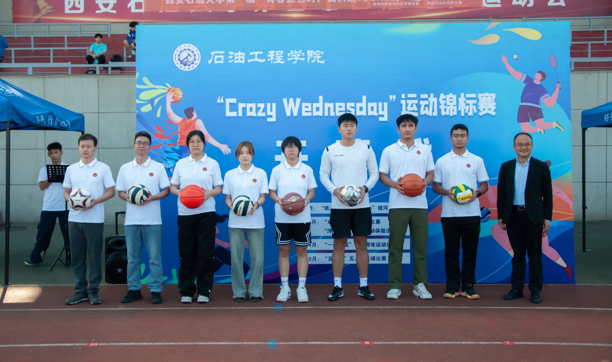 秋色浩無際,風(fēng)露洗晴空。924日,石油工程學(xué)院在鄠邑校區(qū)田徑場(chǎng)舉辦CRAZY WEDNESDAY瘋狂星期三運(yùn)動(dòng)錦標(biāo)賽開幕式。副校長(zhǎng)趙健,黨委辦公室(校長(zhǎng)辦公室)、黨委學(xué)生工作部、石油工程學(xué)院、體育學(xué)院負(fù)責(zé)同志,受聘教練員、師生代表300余人參加開幕式。