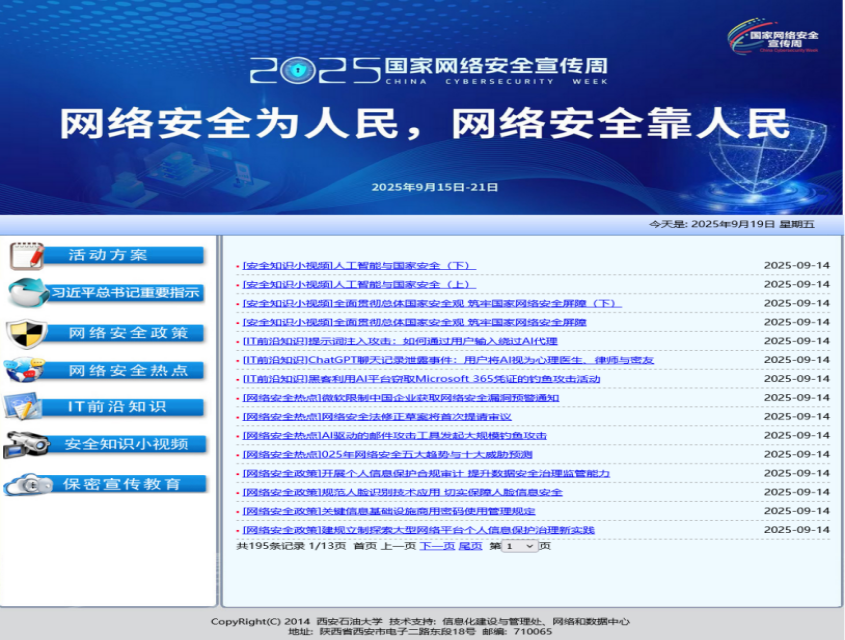 2025年9月15日至21日,西安石油大學(xué)圍繞“網(wǎng)絡(luò)安全為人民,網(wǎng)絡(luò)安全靠人民——以高水平安全守護(hù)高質(zhì)量發(fā)展”主題,組織開(kāi)展第十二屆國(guó)家網(wǎng)絡(luò)安全宣傳周系列活動(dòng)。此次活動(dòng)嚴(yán)格落實(shí)陜西省教育廳《2025 年陜西省教育系統(tǒng)第十二屆國(guó)家網(wǎng)絡(luò)安全宣傳周活動(dòng)實(shí)施方案》要求,深入宣傳貫徹習(xí)近平總書(shū)記關(guān)于網(wǎng)絡(luò)強(qiáng)國(guó)的重要思想及“四個(gè)堅(jiān)持”重要指示精神,普及網(wǎng)絡(luò)安全領(lǐng)域法律法規(guī),全面提升廣大師生網(wǎng)絡(luò)安全意識(shí)與防護(hù)能力。我校信息化建設(shè)與管理處會(huì)同宣傳部、學(xué)生工作部、保衛(wèi)部等部門(mén)組織開(kāi)展了豐富多彩的網(wǎng)絡(luò)安全周宣傳活動(dòng),具體活動(dòng)如下: