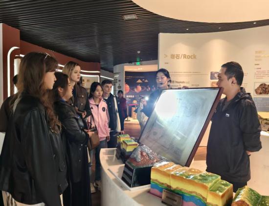 參觀學(xué)習(xí)環(huán)節(jié),師生們沉浸式參觀中心展廳與實驗室,從地學(xué)領(lǐng)域國際合作成果展板到各類地質(zhì)標(biāo)本實物,深入了解上合組織成員國在地質(zhì)調(diào)查、資源勘探、人才培養(yǎng)等領(lǐng)域的國際合作歷程與突破。大家仔細(xì)觀察電子探針、場發(fā)射掃描電鏡等高精度儀器,了解其在地質(zhì)樣本分析與地質(zhì)結(jié)構(gòu)研究中的原理與應(yīng)用。過程中,國際學(xué)生們結(jié)合專業(yè)所學(xué)積極提問,科研人員耐心解答,現(xiàn)場互動氛圍熱烈。