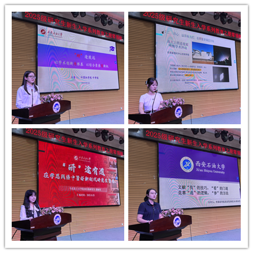 雁塔校區(qū)會(huì)場(chǎng)上,來(lái)自石油工程學(xué)院的博士羅開慶以《仰望星空,腳踏實(shí)地——研究生科研規(guī)劃與方法實(shí)踐分享》為題,結(jié)合自身從碩士到博士的科研進(jìn)階經(jīng)歷,給同學(xué)們分享了科研實(shí)踐方法建議,希望學(xué)弟學(xué)妹們?cè)诳蒲袑W(xué)習(xí)中勤記錄、善總結(jié),并在此基礎(chǔ)上運(yùn)用“嫁接法”“轉(zhuǎn)移法”積極進(jìn)行科研創(chuàng)新探索。地球科學(xué)與工程學(xué)院博士章鑫以《讓思想落筆,讓創(chuàng)新落地:論文與專利的研途雙翼》為題,從思、構(gòu)、寫三個(gè)方面分享了論文創(chuàng)作的思路和方法,并圍繞想、提、護(hù)三個(gè)關(guān)鍵詞為新生講解了如何進(jìn)行專利構(gòu)思、方案提煉以及創(chuàng)新落地?;瘜W(xué)化工學(xué)院的碩士勇志華以《從“適應(yīng)”到“起跑”,解鎖論文、競(jìng)賽與科研生活新節(jié)奏》為題,結(jié)合自己的申博經(jīng)歷用4個(gè)優(yōu)先級(jí)給新生提出研究生科研學(xué)習(xí)生活的規(guī)劃建議,同時(shí)分享了他悉心整理的AI科研工具集。機(jī)械工程學(xué)院的碩士張伊晨以《科研競(jìng)賽齊驅(qū)并進(jìn),機(jī)械學(xué)子的突破與成長(zhǎng)》為題,分享了她參加科研競(jìng)賽的三個(gè)心法:作品選題、團(tuán)隊(duì)建設(shè)、展示表達(dá),總結(jié)出強(qiáng)大的技術(shù)加出色的表達(dá),將會(huì)助力競(jìng)賽的成功。