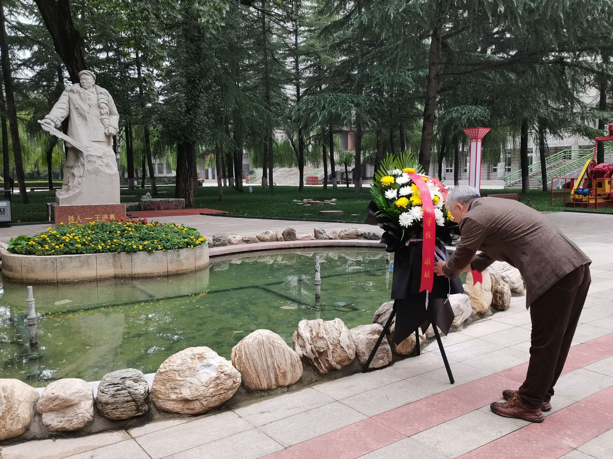 隨后,黨委書(shū)記司馬文龍向鐵人雕像深深鞠躬,并為鐵人雕像敬獻(xiàn)花籃、整理花籃緞帶。