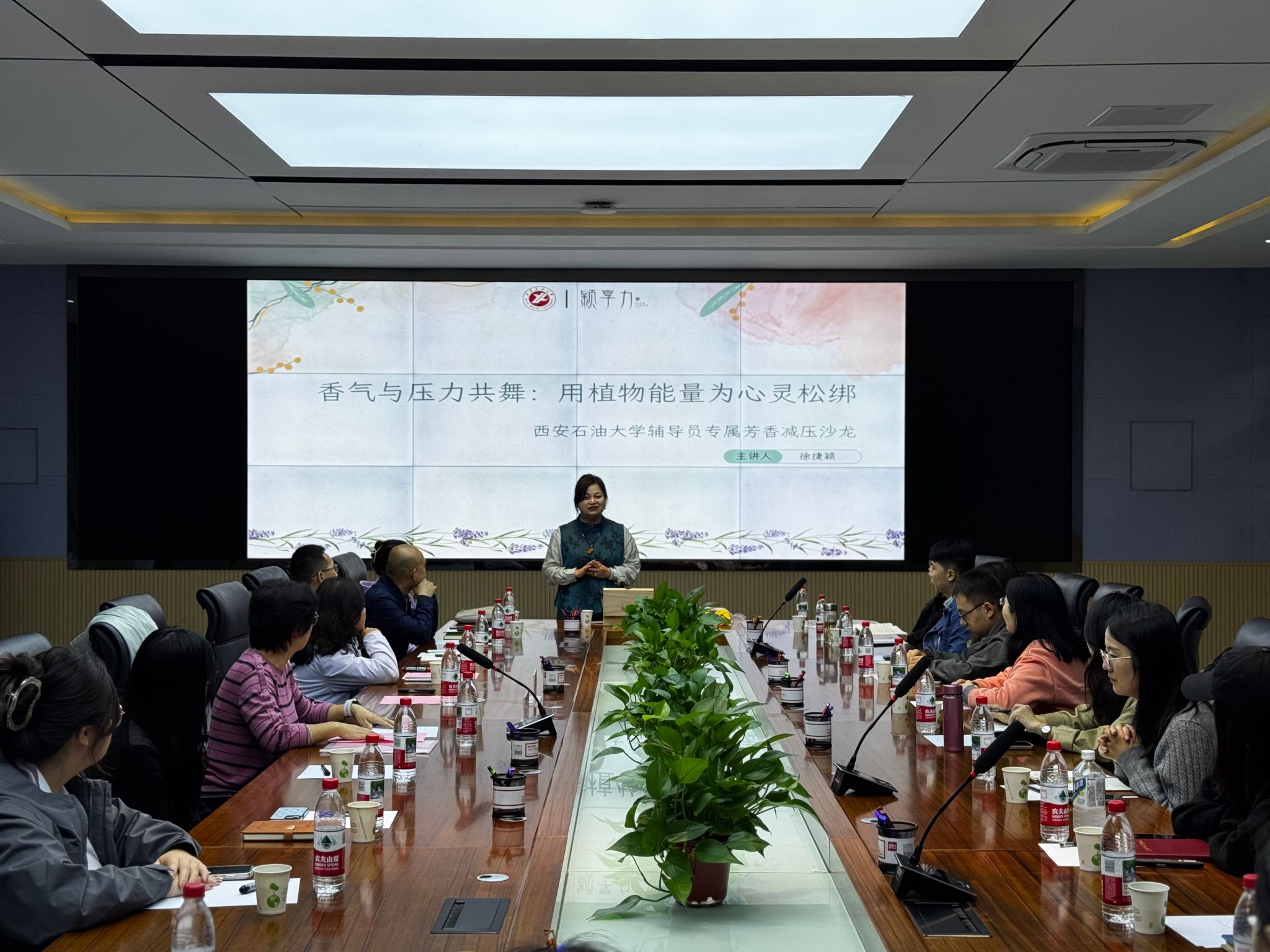 為進一步關(guān)愛學工干部身心健康,提升職業(yè)幸福感,一場《香氣與壓力共舞:用植物能量為心靈松綁》的西安石油大學學工干部專屬芳香減壓沙龍,于10月11日上午在我校鄠邑校區(qū)博覽樓A116成功舉辦。本次活動特邀我校電子工程學院2001屆校友、國家衛(wèi)健委認證健康管理師徐捷穎女士重返母校,以其深耕芳香療法領(lǐng)域22年的跨界經(jīng)驗,為學工干部們帶來了一場融科學、藝術(shù)與實踐于一體的身心療愈之旅。