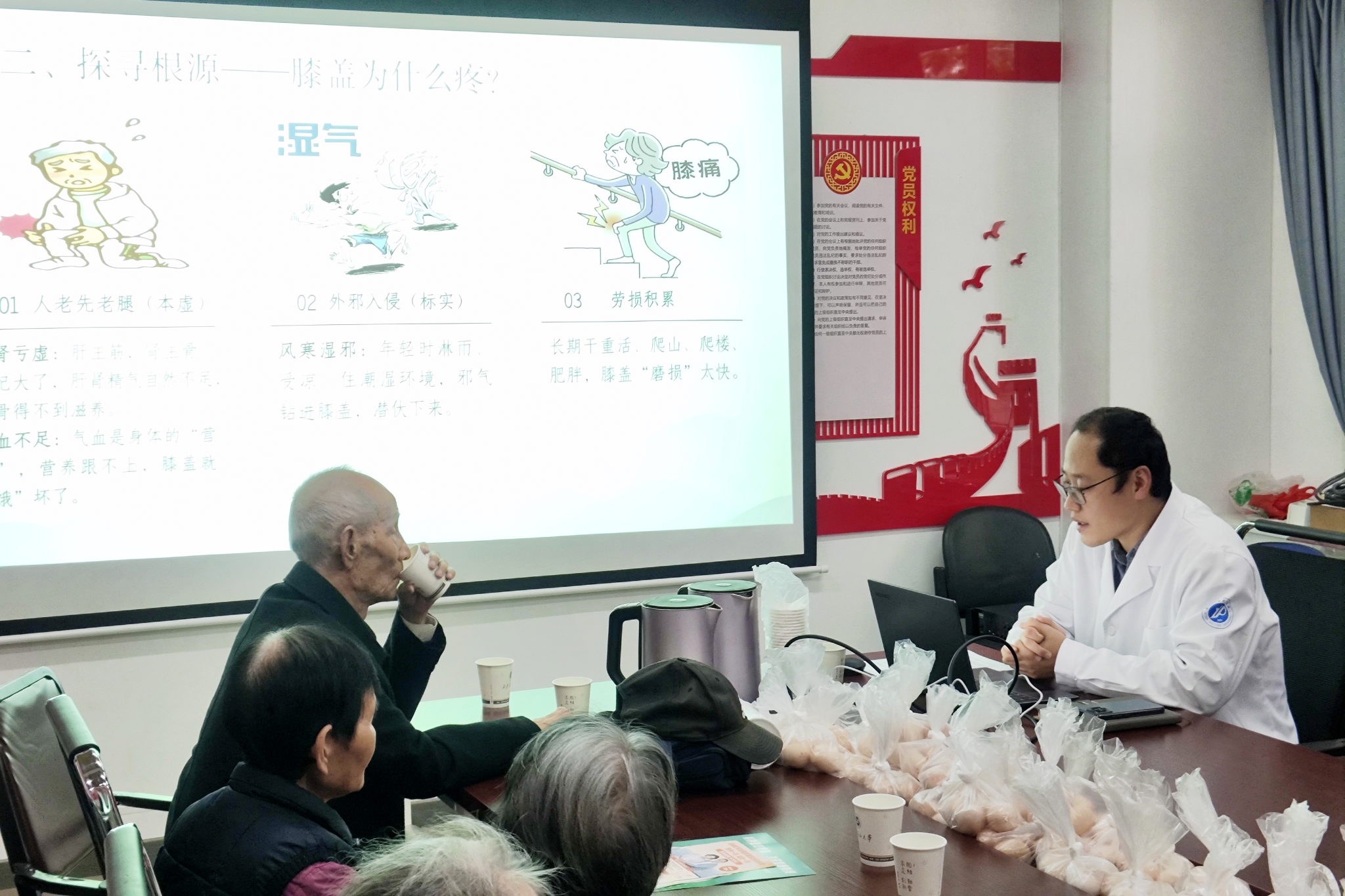 秋冬時(shí)節(jié)氣溫驟降,既是流感等傳染病的高發(fā)期,也是關(guān)節(jié)炎、高血壓等慢性病的易復(fù)發(fā)時(shí)段。針對(duì)這一健康痛點(diǎn),校醫(yī)院精心設(shè)計(jì)講座內(nèi)容,邀請(qǐng)兩位醫(yī)生從不同維度帶來實(shí)用指導(dǎo):趙利劍醫(yī)生聚焦中老年人高發(fā)的關(guān)節(jié)炎,從中醫(yī)辨證施治角度切入,不僅糾正了日常生活中常見的關(guān)節(jié)養(yǎng)護(hù)錯(cuò)誤姿勢,更提出“增加肌肉鍛煉,不增加關(guān)節(jié)負(fù)荷”的科學(xué)理念,通過演示正確鍛煉方法,手把手教大家如何保護(hù)雙膝關(guān)節(jié);洪艷萍醫(yī)生則圍繞秋冬季常見傳染病,詳細(xì)剖析高發(fā)原因與針對(duì)性預(yù)防措施,同時(shí)從飲食、作息、防護(hù)等方面引導(dǎo)大家養(yǎng)成良好生活方式,幫助老同志們科學(xué)防范傳染病侵襲。