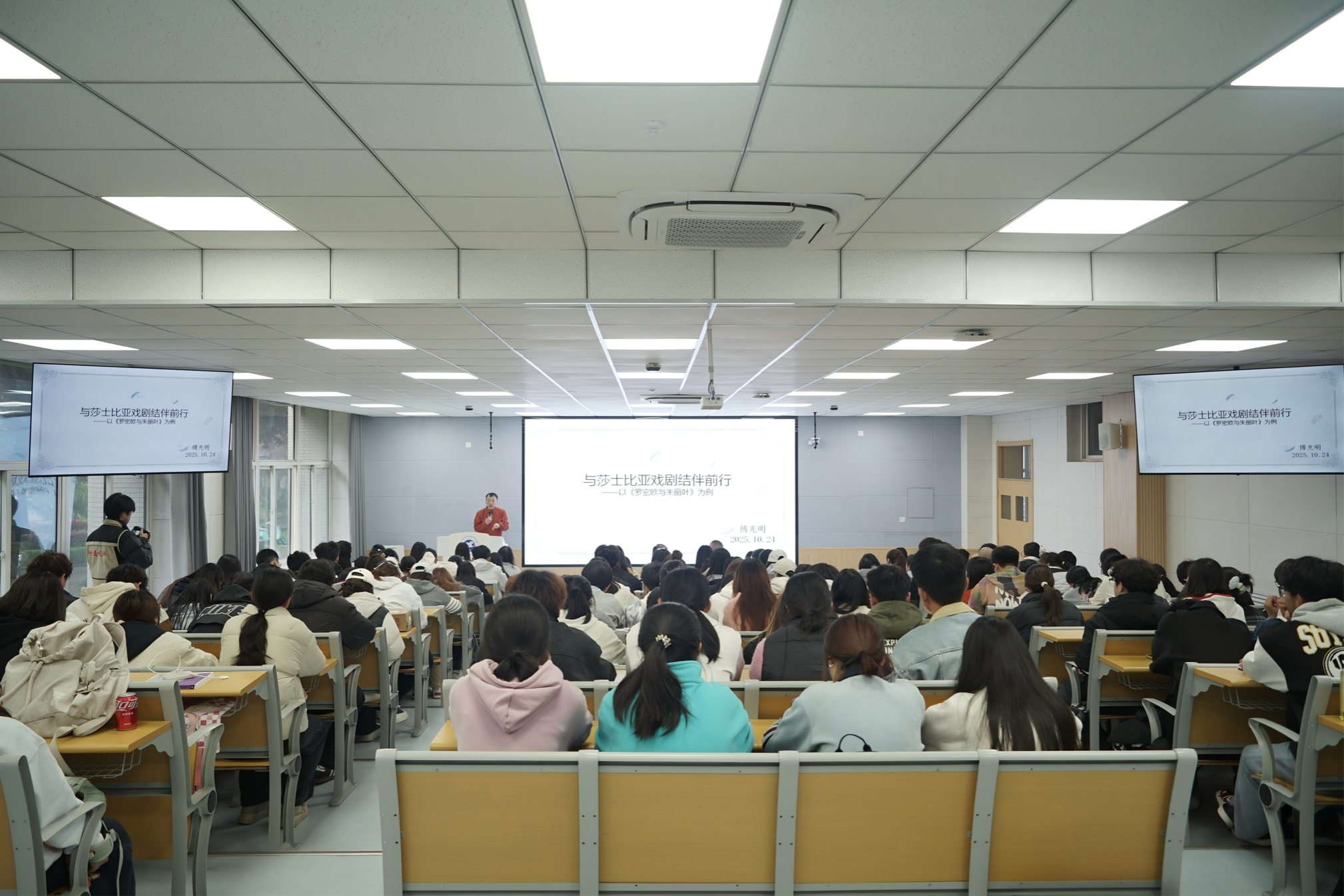 傅光明教授以其深厚的學(xué)術(shù)功底和詼諧幽默的語言風(fēng)格,引領(lǐng)同學(xué)們步入莎士比亞戲劇的瑰麗殿堂。在講解《哈姆雷特》時(shí),他通過對(duì)比“To be, or not to be”這一經(jīng)典獨(dú)白的不同譯本,深入剖析了譯者如何理解與傳遞莎翁筆下的終極哲思;而當(dāng)聚焦《羅密歐與朱麗葉》,他又將目光投向詩意盎然的對(duì)白轉(zhuǎn)譯,生動(dòng)詮釋了這段愛情傳奇在跨越語言屏障時(shí)所迸發(fā)的藝術(shù)張力。他深情回顧了自己與莎士比亞戲劇數(shù)十載的“結(jié)伴”之旅,分享了如何通過細(xì)讀文本、比對(duì)版本、考據(jù)歷史,逐步深入這座文學(xué)寶庫。他鼓勵(lì)青年學(xué)子在求知的道路上,永葆恒心、錘煉匠心、堅(jiān)守對(duì)真理的赤誠之心。