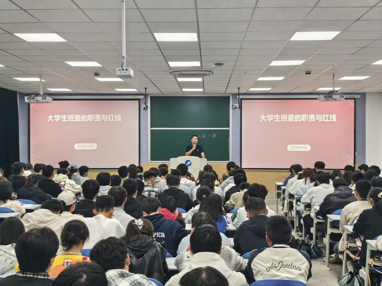 輔導(dǎo)員周鑫以“學(xué)生干部的紀(jì)律與紅線”為主題,從班委職責(zé)、角色定位、工作原則及班委紅線展開敘述,他講到,學(xué)生干部是老師助手、同學(xué)服務(wù)者、班級建設(shè)引領(lǐng)者,要平衡管理與服務(wù)身份,在班級事務(wù)中公平公正、以身作則,嚴(yán)格律己、團(tuán)結(jié)同學(xué),嚴(yán)禁以權(quán)謀私等違紀(jì)行為。同時,他對同學(xué)們在軍訓(xùn)中的優(yōu)異表現(xiàn)予以肯定,鼓勵學(xué)生干部以“鐵人”品格為標(biāo)桿,發(fā)揮橋梁紐帶作用,營造和諧向上班級氛圍。