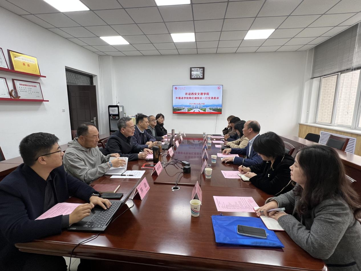 10月29日,西安文理學院外國語學院院長韓紅建一行6人蒞臨我校外國語學院座談交流。座談交流會在鄠邑校區(qū)崇文樓314會議室召開。雙方學院黨政領導和骨干教師代表圍繞辦學思路、人工智能發(fā)展背景下外語學科發(fā)展思路的思考和實踐、課程設置、課程體系建設、教學改革、人才培養(yǎng)質量等議題展開交流探討。