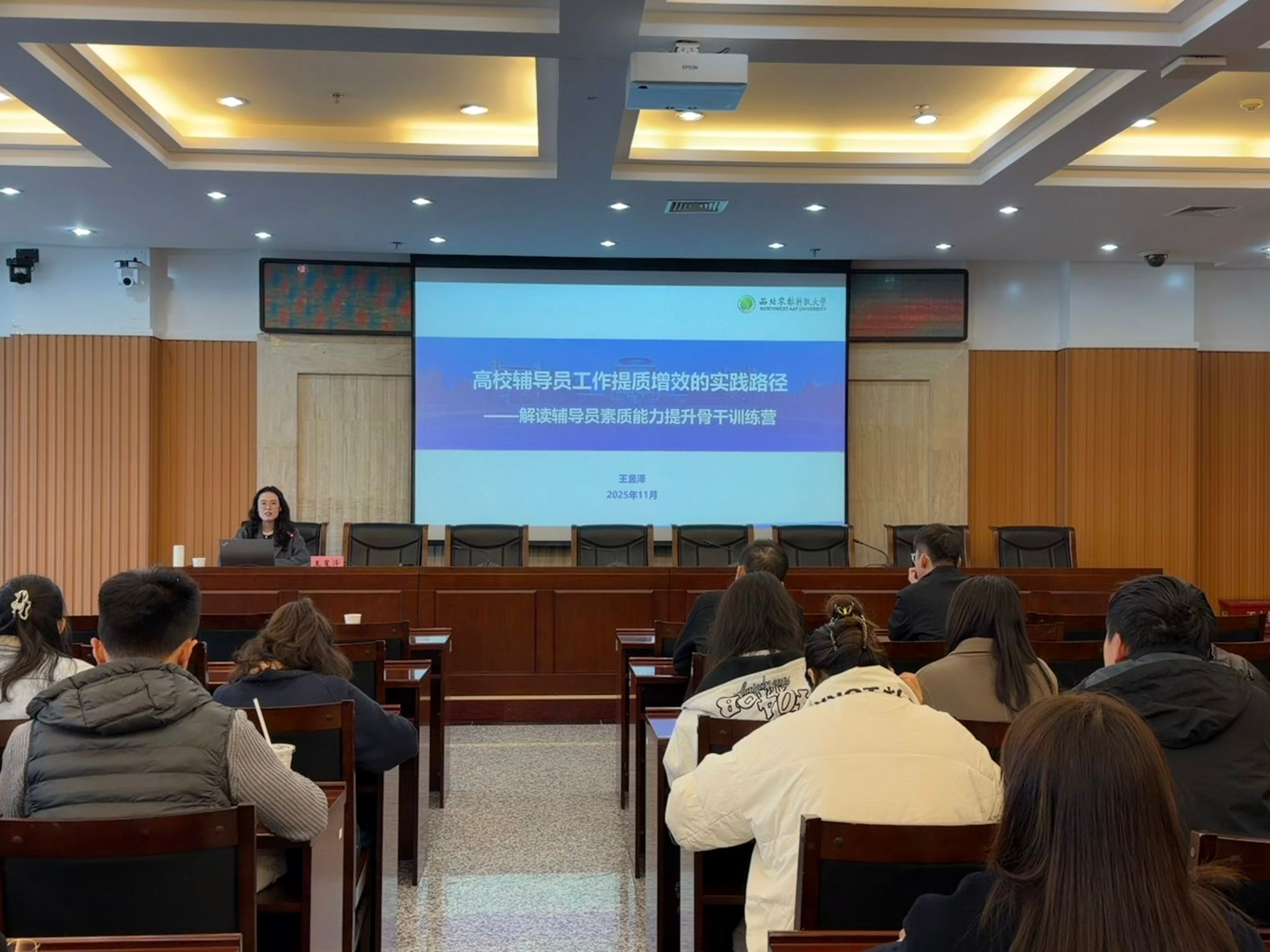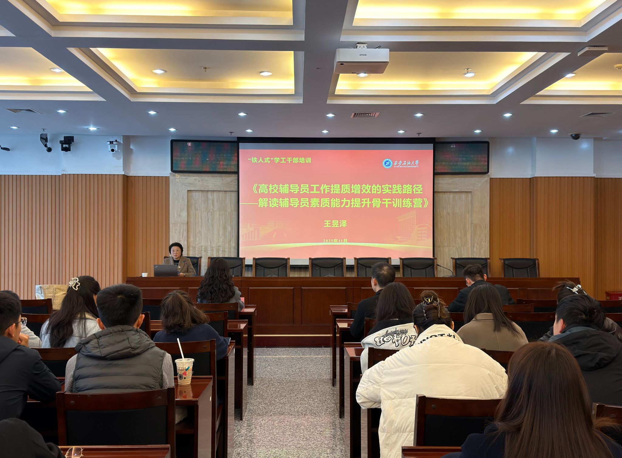 為進(jìn)一步提升我校學(xué)工干部專業(yè)素養(yǎng)與工作實(shí)效,落實(shí)立德樹人根本任務(wù),11 月 3 日上午,我校在鄠邑校區(qū)圖書館第一會(huì)議室舉辦 “鐵人式” 學(xué)工干部培訓(xùn)第七講。本次培訓(xùn)邀請(qǐng)西北農(nóng)林科技大學(xué)資源環(huán)境學(xué)院團(tuán)委書記兼學(xué)生工作秘書王昱澤,作《高校輔導(dǎo)員工作提質(zhì)增效的實(shí)踐路徑 —— 解讀輔導(dǎo)員素質(zhì)能力提升骨干訓(xùn)練營(yíng)》專題報(bào)告。培訓(xùn)由學(xué)生工作部副部長(zhǎng)畢軼慧主持,全體學(xué)工干部參加。
