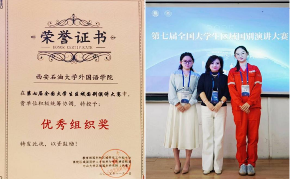 11月1日,第七屆全國大學(xué)生區(qū)域國別演講大賽在杭州落下帷幕。馬克思主義學(xué)院24級研究生陸雨萌和石油工程學(xué)院23級本科生施瀾兩位同學(xué)在外國語學(xué)院教師張磊指導(dǎo)下,經(jīng)過初賽、復(fù)賽和決賽層層選拔和考驗,斬獲全國總決賽三等獎,取得我校學(xué)子在該項競賽中的歷史性突破。外國語學(xué)院憑借出色的組織能力,獲得優(yōu)秀組織獎。