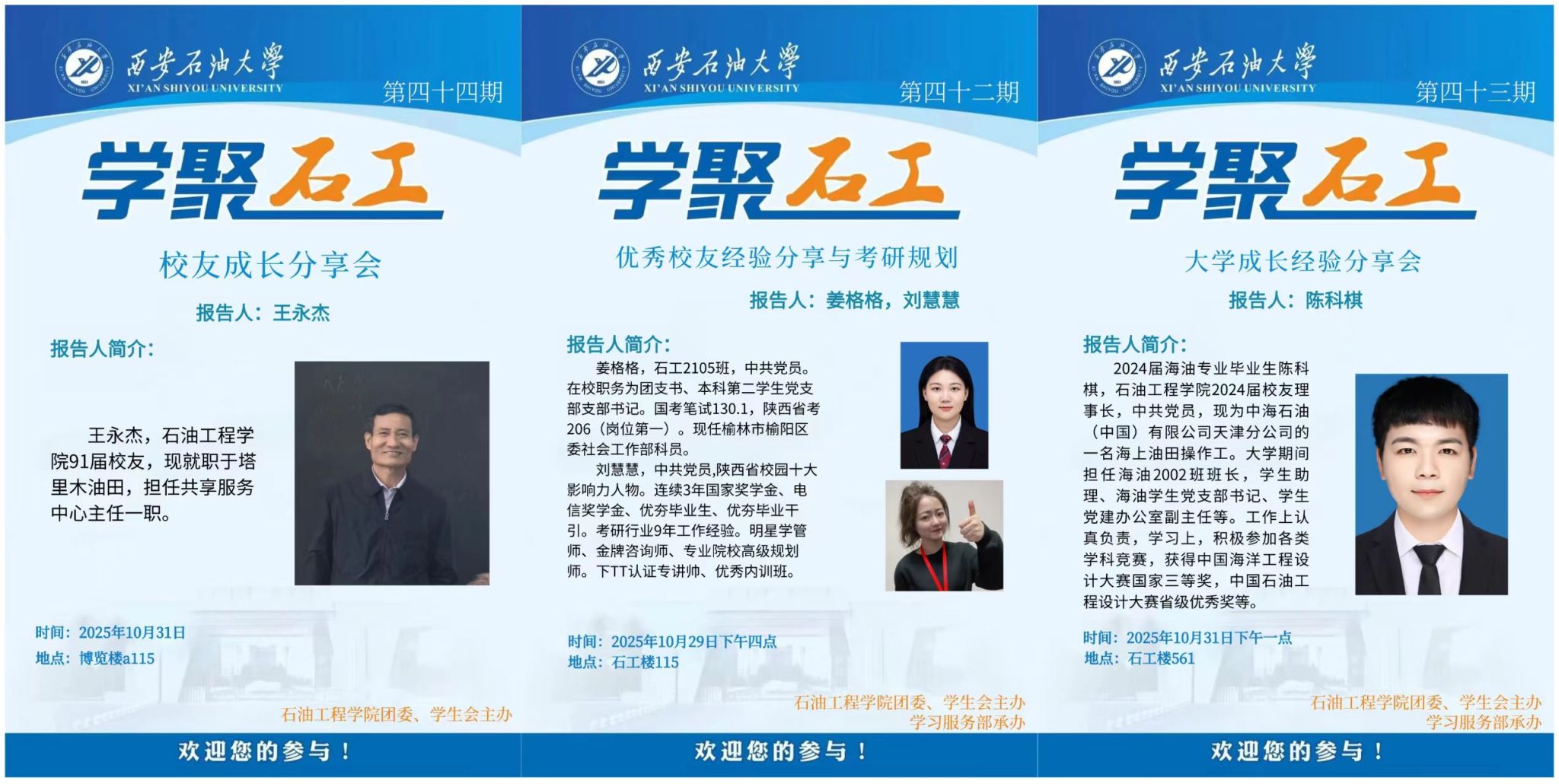 石油工程學(xué)院于10月29日至31日開展學(xué)風(fēng)建設(shè)系列活動,通過邀請優(yōu)秀校友與行業(yè)專家開展“小而精”的專題分享,以“早起步、精準(zhǔn)化”的培養(yǎng)思路,助力學(xué)生明晰發(fā)展方向,為學(xué)院學(xué)風(fēng)建設(shè)注入持續(xù)動能。