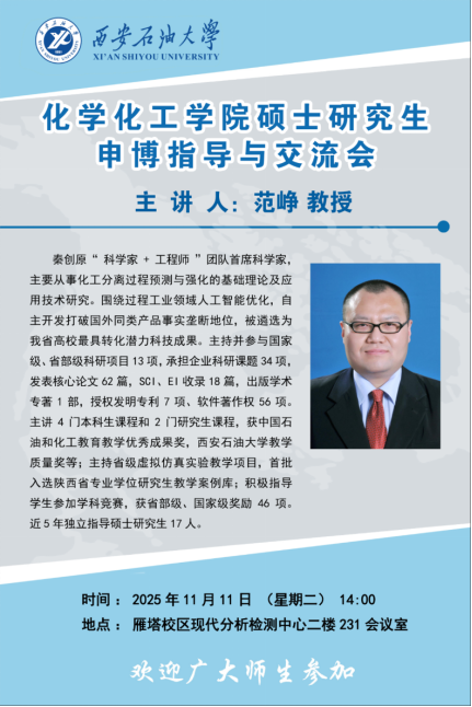 為幫助有申博意向的碩士畢業(yè)生明確發(fā)展方向、掌握申請技巧,11月11日下午,化學(xué)化工學(xué)院在雁塔校區(qū)學(xué)院會議室召開2026屆碩士畢業(yè)生申博指導(dǎo)與交流會。學(xué)院副院長范崢、黨委副書記喬曉、研究生輔導(dǎo)員曹勃全體有申博意向的2026屆碩士畢業(yè)生參會,會議由黨委副書記喬曉主持。