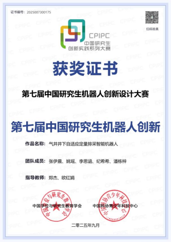 9月26日至29日,第七屆中國研究生機器人創(chuàng)新設(shè)計大賽全國總決賽在山東省濟南市融創(chuàng)國際會議中心隆重舉辦。本屆大賽報名啟動以來,全國224家培養(yǎng)單位的1545支隊伍參賽,較去年增加330余支。為保證大賽評審工作公平公正,大賽組委會邀請70家單位159位專家擔任初賽評委。8月27日大賽初賽評審?fù)瓿?,最終來自104家培養(yǎng)單位的325支隊伍入圍決賽。我校機械工程學院“氣井井下自適應(yīng)定量排采智能機器人”作品獲得全國三等獎,團隊成員有張伊晨、姚瑤、李思涵、紀希希、潘棟梓,鄭杰、歐紅娟任指導教師。