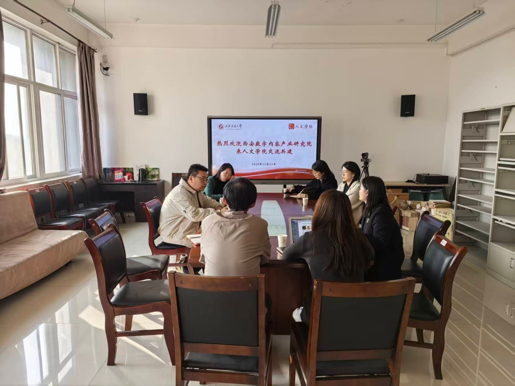 宣講會(huì)結(jié)束后,院企雙方移步人文學(xué)院會(huì)議室舉行了合作共建座談會(huì)。人文學(xué)院院長方亭、中文系主任王敬艷、新聞系主任馬可、設(shè)計(jì)系副主任王寧鑫及何奇穎、新聞系教師吳曉輝、學(xué)生辦公室副主任范嘉欣等學(xué)院領(lǐng)導(dǎo)與教師代表,與西安數(shù)字內(nèi)容產(chǎn)業(yè)研究院代表進(jìn)行了深入交流。