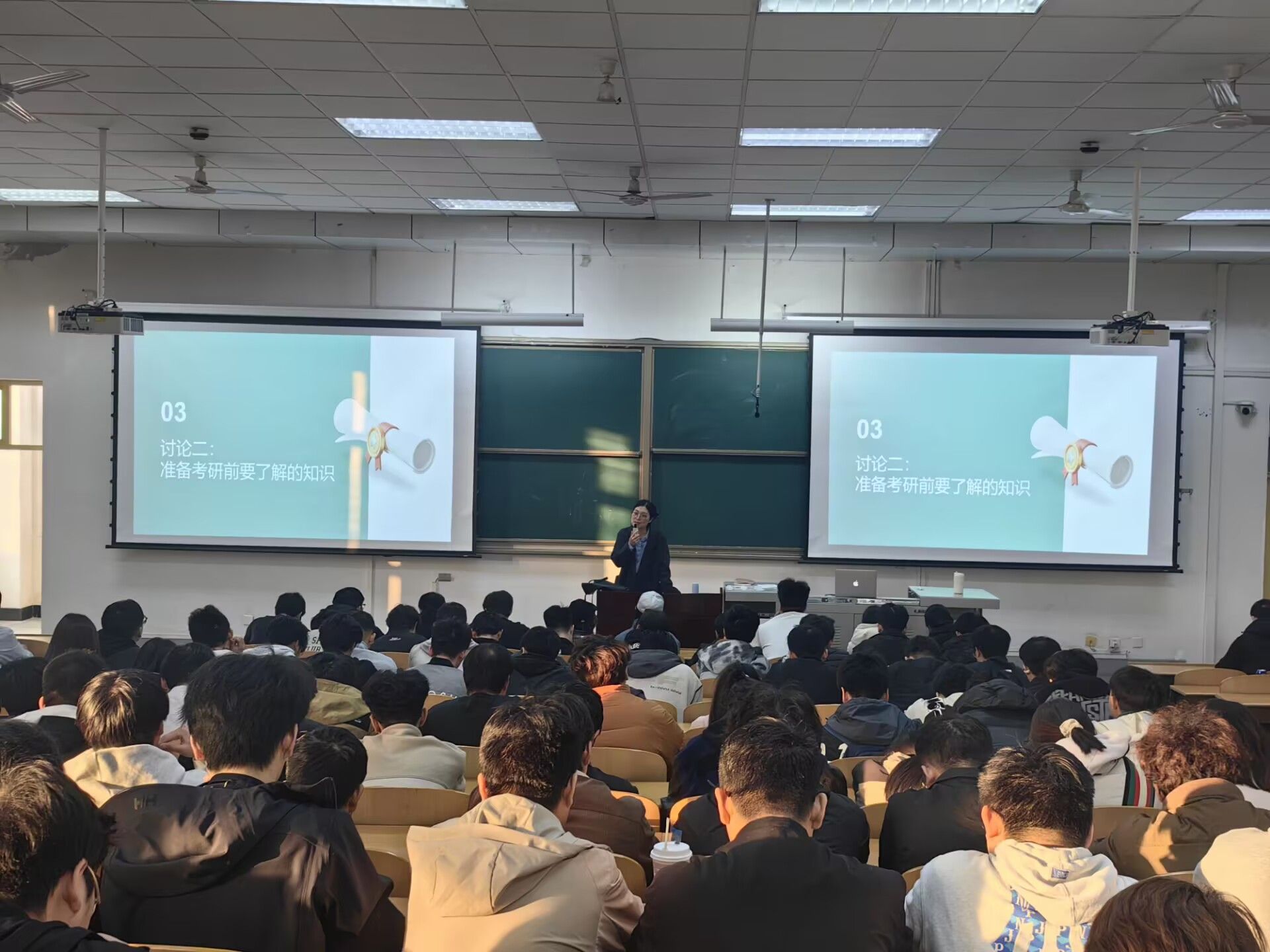 考研輔導(dǎo)老師李海霞為同學(xué)們帶來(lái)了一場(chǎng)內(nèi)容詳實(shí)、富有啟發(fā)性的講座。她從社會(huì)發(fā)展需求、個(gè)人價(jià)值提升、職業(yè)發(fā)展前景等多個(gè)維度,深入剖析了考研的重要性與優(yōu)勢(shì)。同時(shí),她結(jié)合多年指導(dǎo)經(jīng)驗(yàn),為同學(xué)們系統(tǒng)講解了考研準(zhǔn)備期間的關(guān)鍵環(huán)節(jié),包括院校專業(yè)選擇、復(fù)習(xí)策略制定、時(shí)間管理方法以及心態(tài)調(diào)整技巧等,為同學(xué)們提供了考研就業(yè)的方向性指引。同學(xué)們紛紛表示,通過(guò)講座,受益匪淺,要提前做好職業(yè)規(guī)劃,做到就業(yè)考研兩手抓。