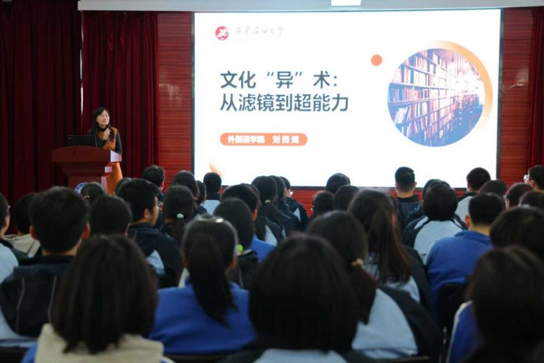 劉西娟老師為學(xué)生們作了題為《文化“異”術(shù):從濾鏡到超能力》的專(zhuān)題講座。她從文化意識(shí)的培養(yǎng)出發(fā),引導(dǎo)學(xué)生打破刻板印象,以多元視角理解世界,深入分析不同文化背景下的思維差異。