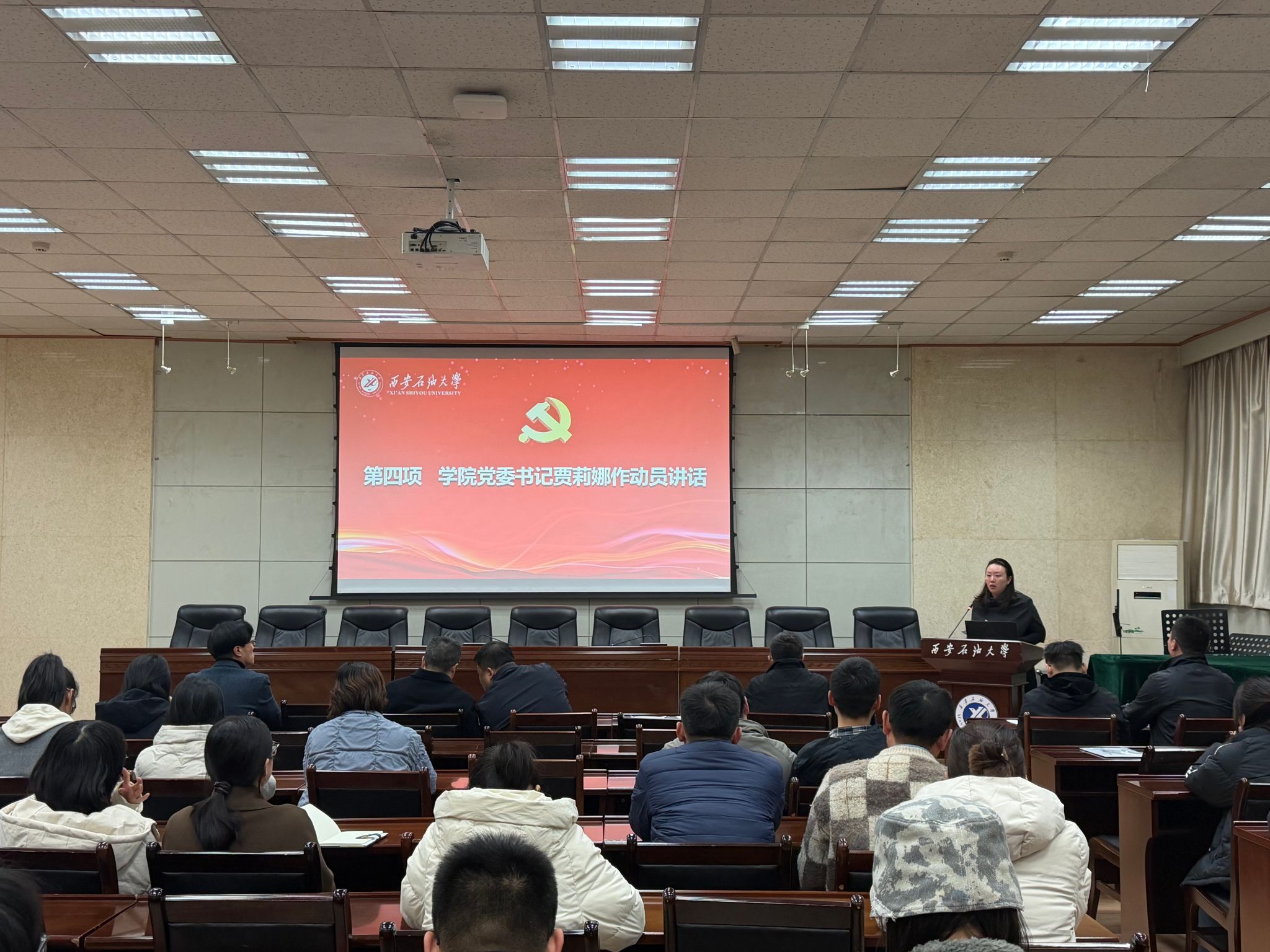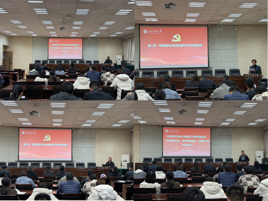 為深入學(xué)習(xí)貫徹黨的二十屆四中全會(huì)精神,落實(shí)學(xué)校第三次黨代會(huì)精神,全面提升基層黨組織建設(shè)質(zhì)量,強(qiáng)化二級(jí)學(xué)院的政治屬性和育人責(zé)任,促進(jìn)黨建和中心工作融合互促,重點(diǎn)提升教師特別是黨員教師在教學(xué)、科研、管理和學(xué)習(xí)中的模范帶頭作用,結(jié)合深入貫徹中央八項(xiàng)規(guī)定精神學(xué)習(xí)教育工作安排,11月21日,管道工程學(xué)院黨委在雁塔校區(qū)第三會(huì)議室舉辦了“學(xué)黨章鑄忠誠(chéng),悟思想強(qiáng)使命”專題學(xué)習(xí)班開班儀式,學(xué)院班子全體成員、全體教職工、研究生黨員代表參加了會(huì)議。學(xué)院學(xué)生工作辦公室主任孫劍秋主持會(huì)議。