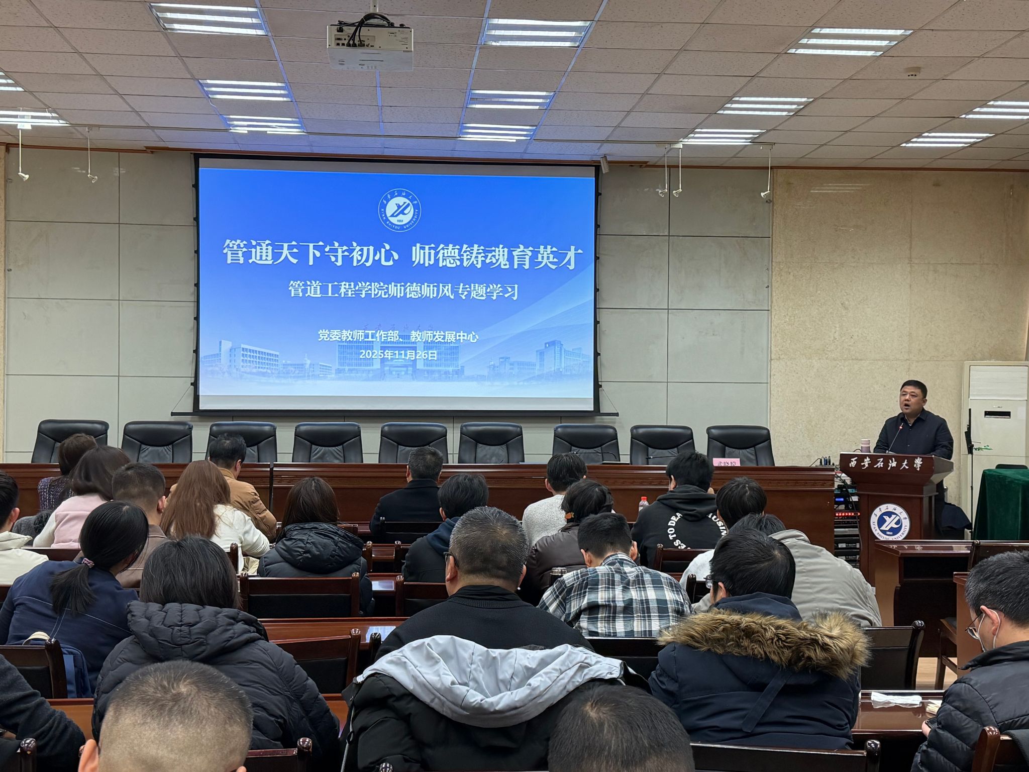 11月26日下午,由管道工程學(xué)院黨委主辦的“學(xué)黨章鑄忠誠(chéng),悟思想強(qiáng)使命”專題學(xué)習(xí)班第一講在雁塔校區(qū)西階第三會(huì)議室舉行。校黨委教師工作部部長(zhǎng)、教師發(fā)展中心主任武曉朦教授擔(dān)任主講,主講題目為“管通天下守初心 師德鑄魂育英才”,學(xué)院全體教職工及研究生代表參加學(xué)習(xí)。會(huì)議由學(xué)院黨委副書記高亮主持。