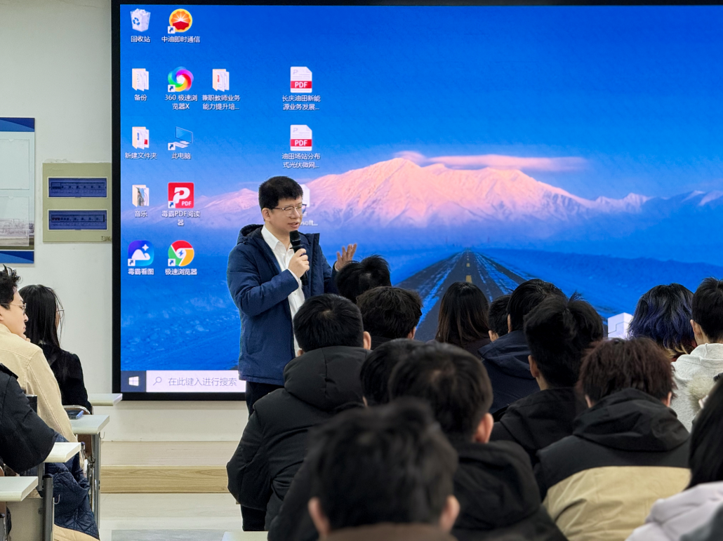 在座談會上,校友蔣守強以長慶油田新能源業(yè)務發(fā)展及項目管理為題就油氣與新能源融合技術的現(xiàn)場應用為同學們做了介紹。新能源學院副院長張明從圍繞“什么是新能源”“國家為什么要發(fā)展新能源”“油田企業(yè)新能源應用發(fā)展趨勢”等三個問題展開系統(tǒng)講授,讓同學們了解到相較傳統(tǒng)能源新能源的發(fā)展優(yōu)勢、當前國際國內(nèi)形勢下國家發(fā)展新能源的必要性以及未來油田企業(yè)對新能源人才的需求等。隨后研究生們圍繞油氣行業(yè)發(fā)展趨勢、長慶油田對人才的招聘需求以及個人在油氣行業(yè)的未來發(fā)展與蔣守強校友及張明副院長進行了互動交流,現(xiàn)場氣氛熱烈。