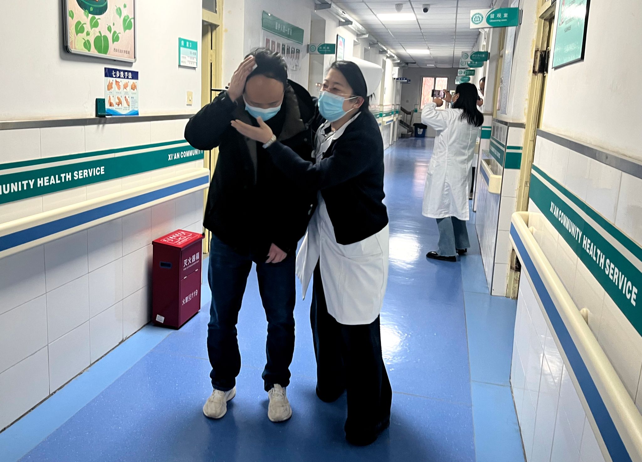 與此同時(shí),疏散引導(dǎo)人員快速打開安全出口,引導(dǎo)就診患者及醫(yī)護(hù)人員用濕毛巾捂住口鼻,彎腰低姿沿預(yù)定疏散路線快速撤離。針對(duì)行動(dòng)不便的模擬患者,工作人員采用攙扶、輪椅轉(zhuǎn)運(yùn)等方式全程協(xié)助,做到不推擠、不遺漏,確保所有人員在規(guī)定時(shí)間內(nèi)安全撤離至室外指定集合點(diǎn),各小組隨即快速清點(diǎn)人數(shù)并向指揮部匯報(bào)。醫(yī)院應(yīng)急醫(yī)療小組同步在疏散現(xiàn)場(chǎng)搭建臨時(shí)救護(hù)點(diǎn),丁麗團(tuán)隊(duì)全力協(xié)助醫(yī)療演練開展,配合做好救護(hù)物資轉(zhuǎn)運(yùn)、模擬患者傷情配合、救治現(xiàn)場(chǎng)輔助等工作,助力醫(yī)療小組高效完成傷口處理、吸氧、頭部包扎等緊急救治流程,充分彰顯醫(yī)療應(yīng)急處置的專業(yè)性與團(tuán)隊(duì)協(xié)作的高效性。