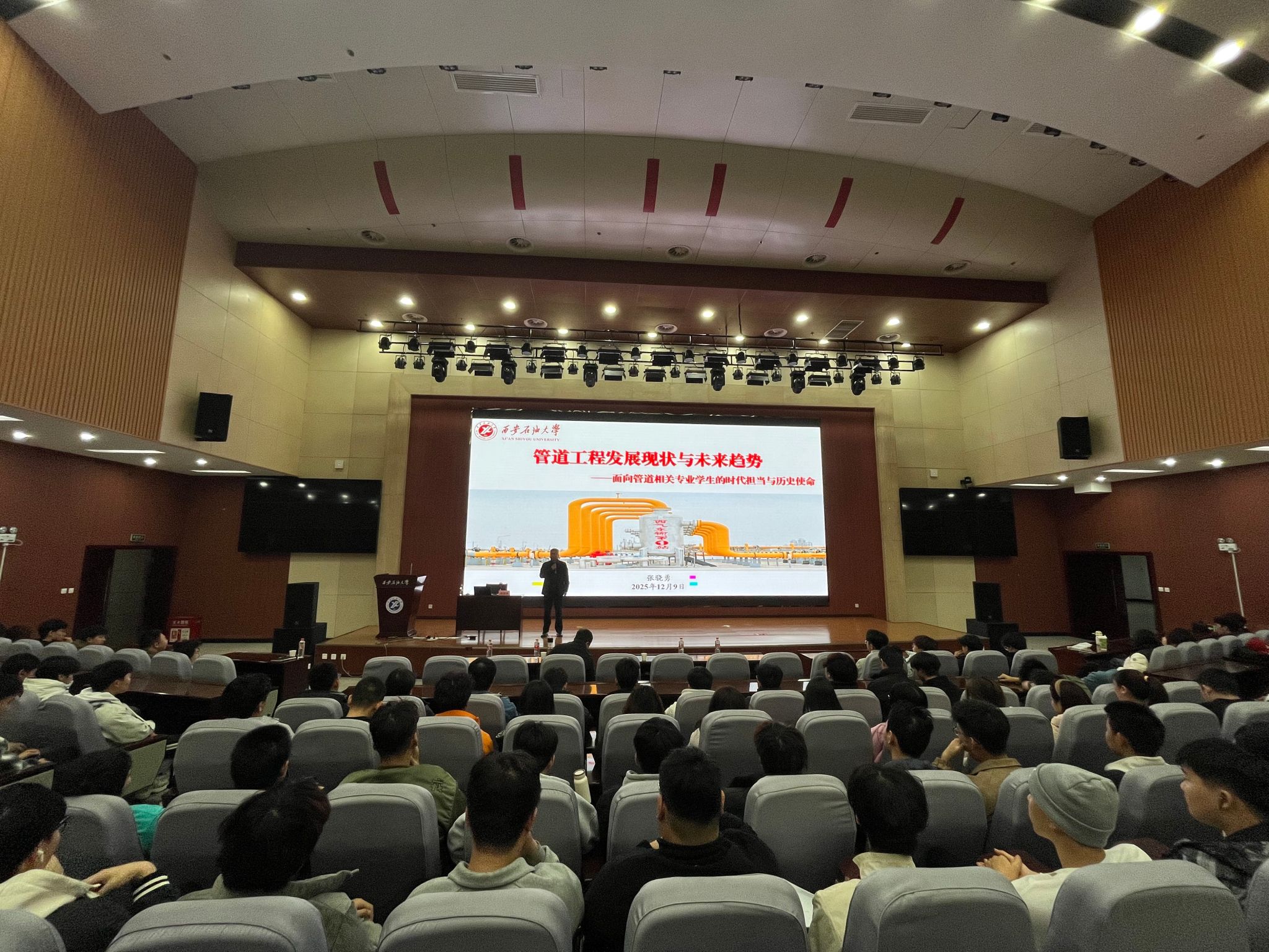 為深入學習貫徹黨的二十屆四中全會精神,引導學生立足學科特色、勇擔時代使命,12月9日,校黨委委員、副校長張驍勇在鄠邑校區(qū)弘石報告廳為管道工程學院本科生講授主題為“管道工程發(fā)展現狀與未來趨勢-面向管道相關專業(yè)學生的時代擔當與歷史使命”專題思政課。學院全體輔導員、本科生代表350余人參會學習,思政課由學院黨委副書記高亮主持。