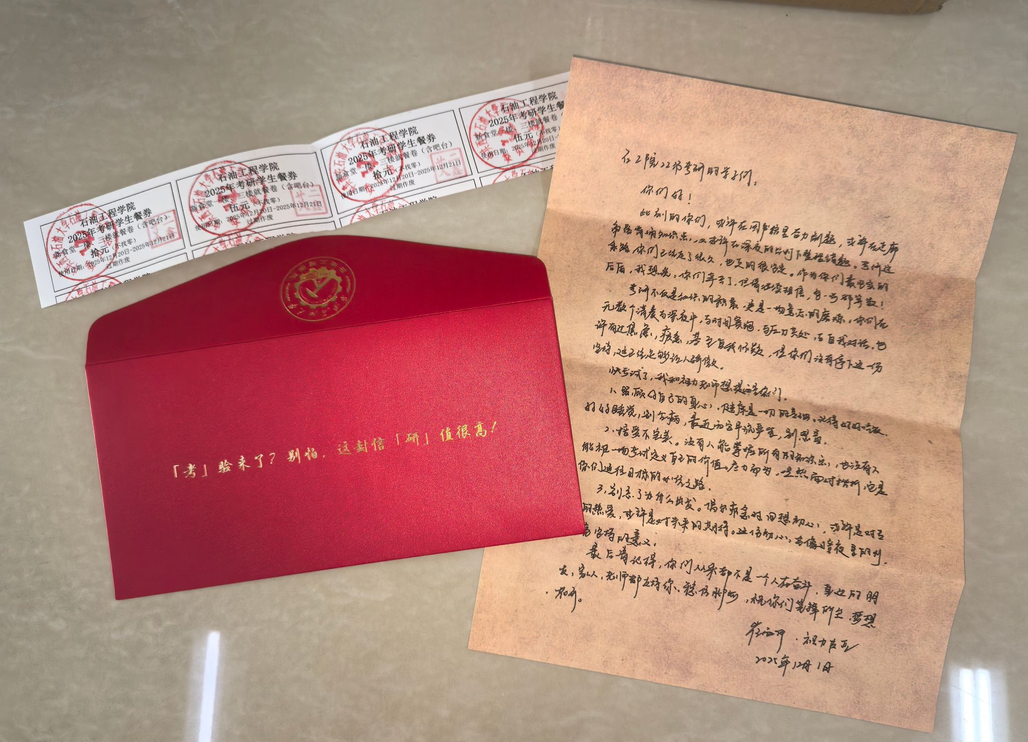 活動(dòng)上,學(xué)院領(lǐng)導(dǎo)與老師們將飽含期許的禮物親手遞至備考學(xué)子手中,一封紅色信箋寄寓運(yùn)當(dāng)頭之祝愿,封面考研錦囊字樣凝結(jié)智慧,封口處院徽如印,靜靜烙下學(xué)院的牽掛與囑托??紤]到考試期間通訊與用餐多有不便,學(xué)院特備暖心餐票,護(hù)航學(xué)子安心落筆尤為珍貴的是,2026屆畢業(yè)班輔導(dǎo)員為每位考生親筆書寫信函,字里行間流淌真情,紙短情長(zhǎng)蘊(yùn)藏深意,讓溫暖的陪伴跨越考場(chǎng)內(nèi)外,成為每一位學(xué)子身后無聲卻堅(jiān)實(shí)的港灣。