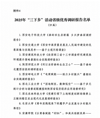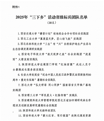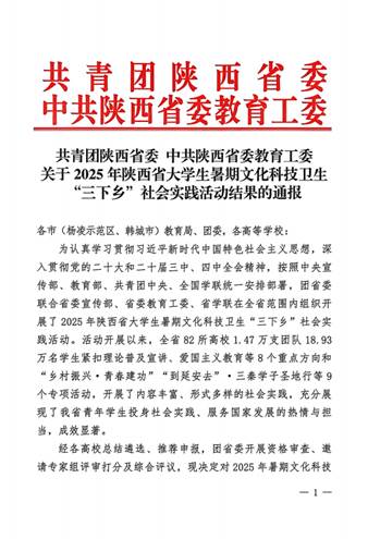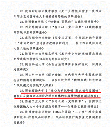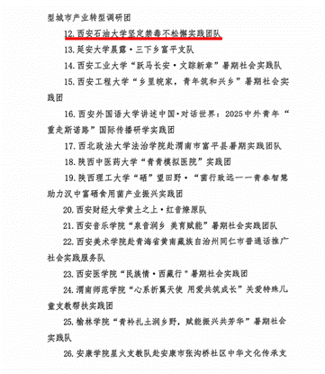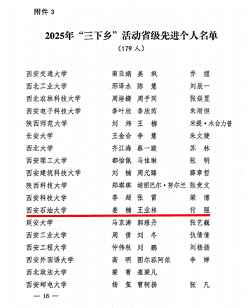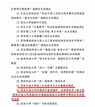 近日,共青團陜西省委、中共陜西省委教育工委在全省范圍內組織開展的2025年陜西省大學生暑期文化科技衛(wèi)生“三下鄉(xiāng)”社會實踐活動評選表彰結果揭曉,我校電子工程學院堅定禁毒不松懈實踐團隊被評為省級標兵團隊,石油工程學院鐵人足跡探尋與文化賡續(xù)實踐團、機械工程學院四載堅守基層情懷,共筑退伍軍人新生路—西安石油大學連續(xù)4年開展基層退伍士兵調研與幫扶社會實踐活動團被評為省級優(yōu)秀團隊,姜楠、王業(yè)林、付強被評為省級先進個人,馬克思主義學院《童心向黨憶崢嶸薪火相傳愛國情暑假社會實踐團不同階段學生群體的抗戰(zhàn)精神教育調研報告》被評為省級優(yōu)秀調研報告,并獲團省委專項資助。