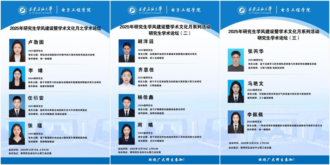 按照學(xué)校研究生工作部關(guān)于2025年研究生學(xué)風(fēng)建設(shè)暨學(xué)術(shù)文化活動(dòng)月的安排部署,12月16日至23日,電子工程學(xué)院2025年研究生學(xué)風(fēng)建設(shè)暨學(xué)術(shù)文化月之研究生學(xué)術(shù)論壇在雁塔校區(qū)會(huì)議中心第三會(huì)議室順利舉行。學(xué)院副院長(zhǎng)楊一、研究生輔導(dǎo)員李君、王曉天以及各年級(jí)研究生代表參會(huì),我院11位研究生代表作專(zhuān)題學(xué)術(shù)匯報(bào)。