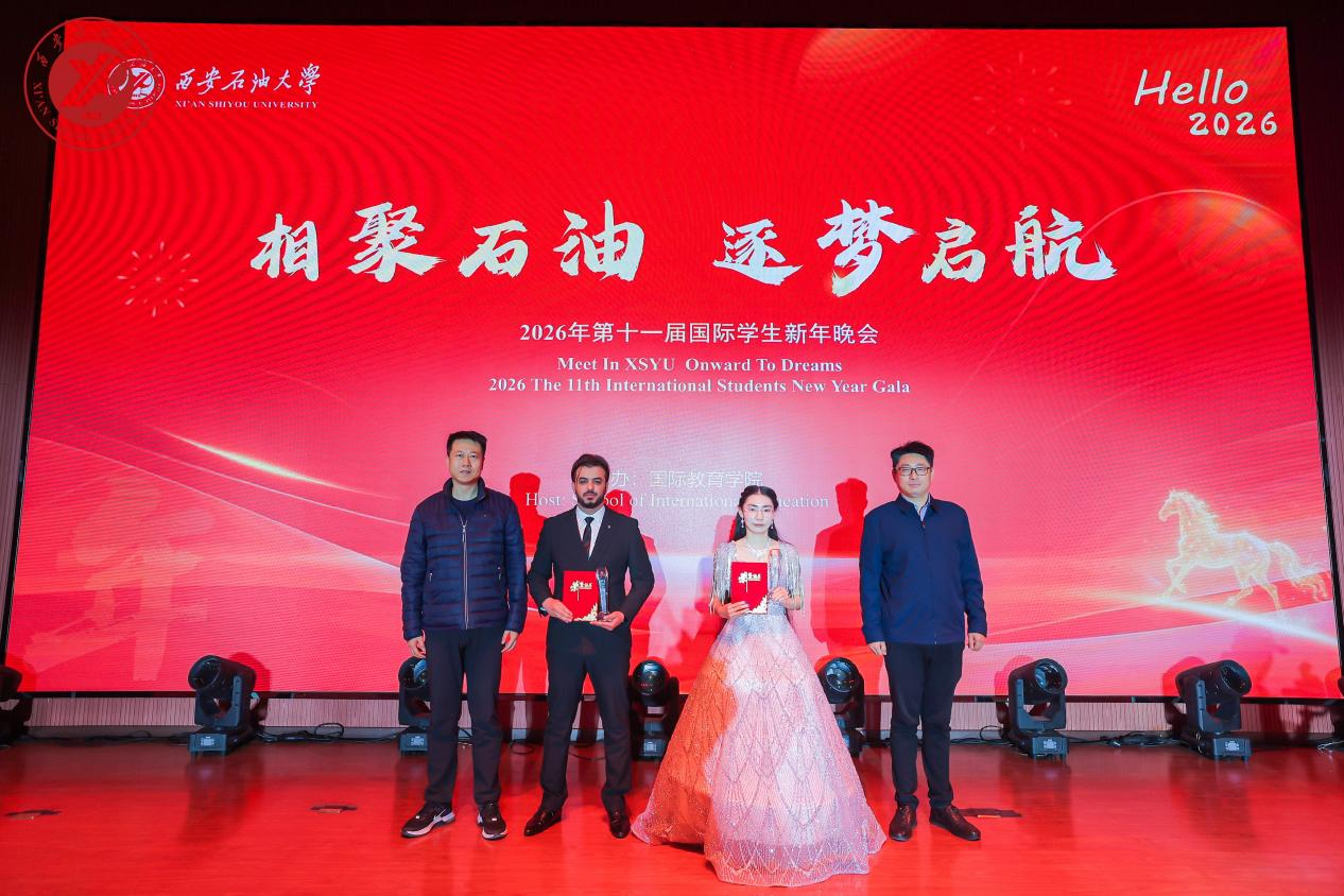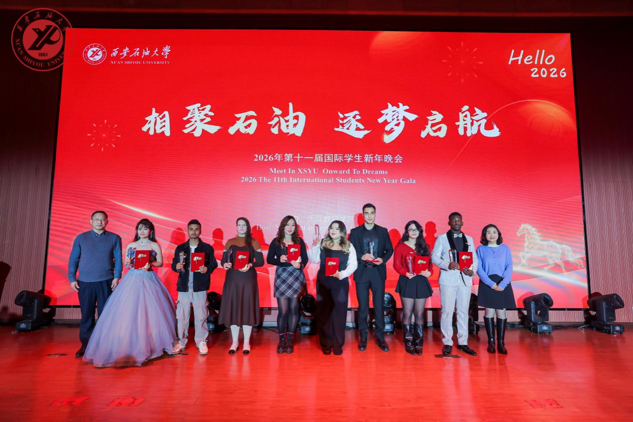12月30日晚,國際教育學(xué)院在鄠邑校區(qū)弘石報告廳成功舉辦“相聚石油·逐夢啟航”2026年第十一屆國際學(xué)生新年晚會。國際合作與交流處處長、國際教育學(xué)院院長董皓致辭,新能源學(xué)院黨委書記顏庭星、保衛(wèi)處副處長王書華、外國語學(xué)院副院長陳武蒞臨現(xiàn)場,處(院)領(lǐng)導(dǎo)秦璟黃愷,國際學(xué)生工作辦公室全體干部及500余名中外學(xué)生共同觀看。