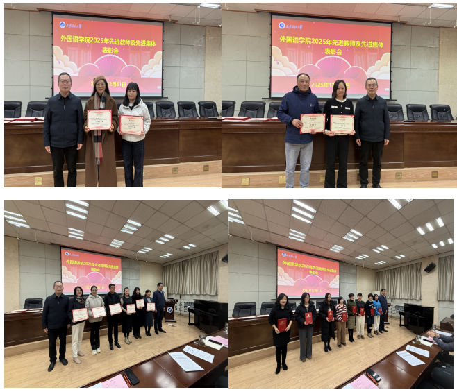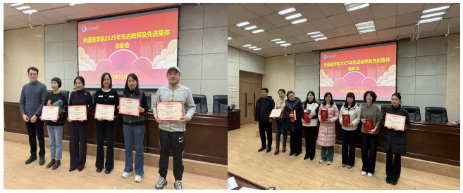 在述職述廉會議之后,學(xué)院召開2025年先進(jìn)教師和先進(jìn)集體的表彰大會,陳武宣讀了《外國語學(xué)院關(guān)于公布2025年度先進(jìn)教師及先進(jìn)集體評選結(jié)果的通知》,對在教育教學(xué)、科學(xué)研究、人才培養(yǎng)、管理服務(wù)等工作中表現(xiàn)突出的4個先進(jìn)集體和29名先進(jìn)教師予以隆重表彰。學(xué)院黨政領(lǐng)導(dǎo)和工會主席為獲獎集體與個人頒發(fā)榮譽(yù)證書,陳武向受表彰的先進(jìn)集體和先進(jìn)教師表示熱烈祝賀,他們身上愛崗敬業(yè)、甘于奉獻(xiàn)的精神,值得全體教師學(xué)習(xí)借鑒,全體教師要以先進(jìn)為標(biāo)桿、以榜樣為力量、主動對標(biāo)看齊,為學(xué)院發(fā)展貢獻(xiàn)自己的力量。