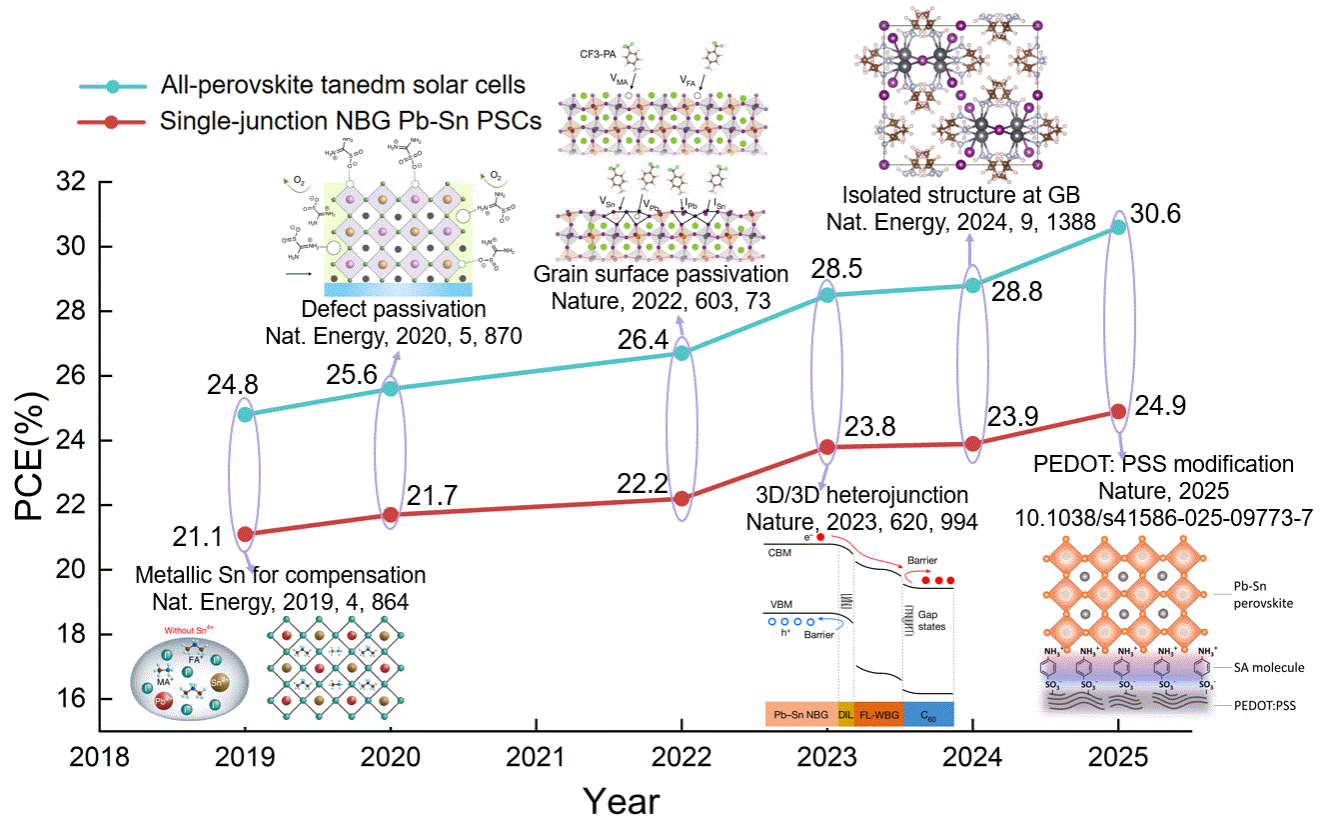 金屬鹵化物鈣鈦礦太陽(yáng)能電池在過(guò)去十年中取得了顯著進(jìn)展,但其單結(jié)器件的效率受限于肖克利-奎伊瑟理論極限。為突破這一瓶頸,構(gòu)建疊層太陽(yáng)能電池成為最有效途徑。全鈣鈦礦疊層電池因其低成本、高效率和柔性兼容性備受關(guān)注,其中窄帶隙鉛-錫混合鈣鈦礦子電池負(fù)責(zé)吸收紅外光子,其性能直接決定疊層器件的整體表現(xiàn)。然而,Sn2?易氧化、結(jié)晶過(guò)程難以控制、薄膜缺陷密度高以及界面能級(jí)不匹配等問(wèn)題,導(dǎo)致嚴(yán)重的非輻射復(fù)合損失、載流子擴(kuò)散長(zhǎng)度不足和提取效率低下,制約了單結(jié)鉛-錫電池達(dá)到約32%的理論效率極限,也阻礙了疊層電池向約46%的理論效率邁進(jìn)。近年來(lái),界面工程策略在抑制缺陷、優(yōu)化能級(jí)排列和提升穩(wěn)定性方面展現(xiàn)出巨大潛力,推動(dòng)單結(jié)鉛-錫電池效率超過(guò)24%,疊層電池效率突破30%。因此,系統(tǒng)總結(jié)當(dāng)前鉛-錫鈣鈦礦界面工程的進(jìn)展,建立研究范式,對(duì)實(shí)現(xiàn)高性能疊層器件的可持續(xù)發(fā)展具有重要意義。