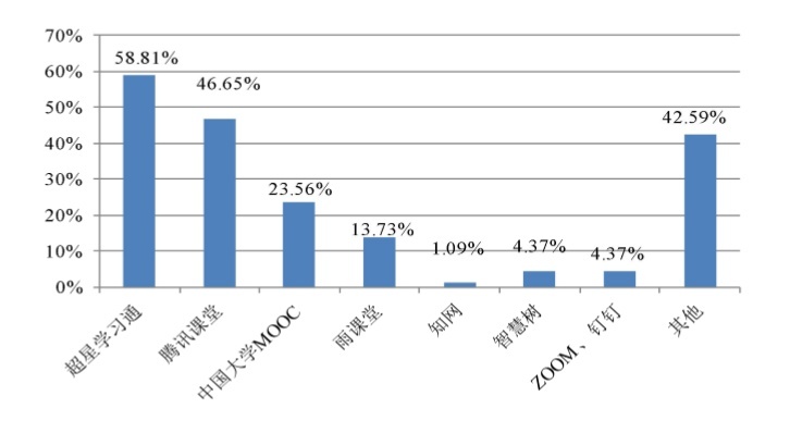 任課教師選用平臺(tái)情況:任課教師使用超星學(xué)習(xí)通、騰訊課堂、中國(guó)大學(xué)MOOC平臺(tái)的老師最多,多選比例分別為58.81%、46.65%、23.56%。