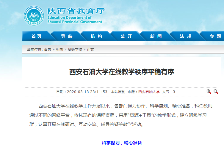 西安石油大學在線教學工作開展以來,各部門通力協作、科學謀劃、精心準備,科任教師通過不同的網絡平臺,依托現有的課程資源,采用“資源+工具”的教學形式,建立班級學習群,認真開展在線研討、互動交流、輔導答疑等教學活動。