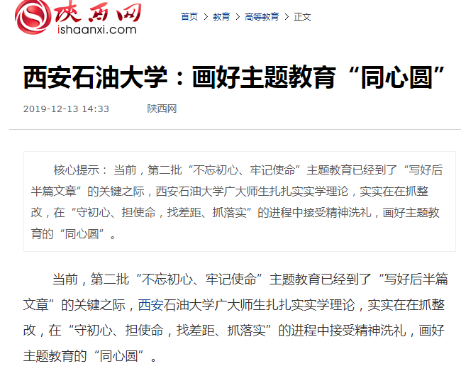 當前,第二批“不忘初心、牢記使命”主題教育已經(jīng)到了“寫好后半篇文章”的關(guān)鍵之際,西安石油大學廣大師生扎扎實實學理論,實實在在抓整改,在“守初心、擔使命,找差距、抓落實”的進程中接受精神洗禮,畫好主題教育的“同心圓”。
